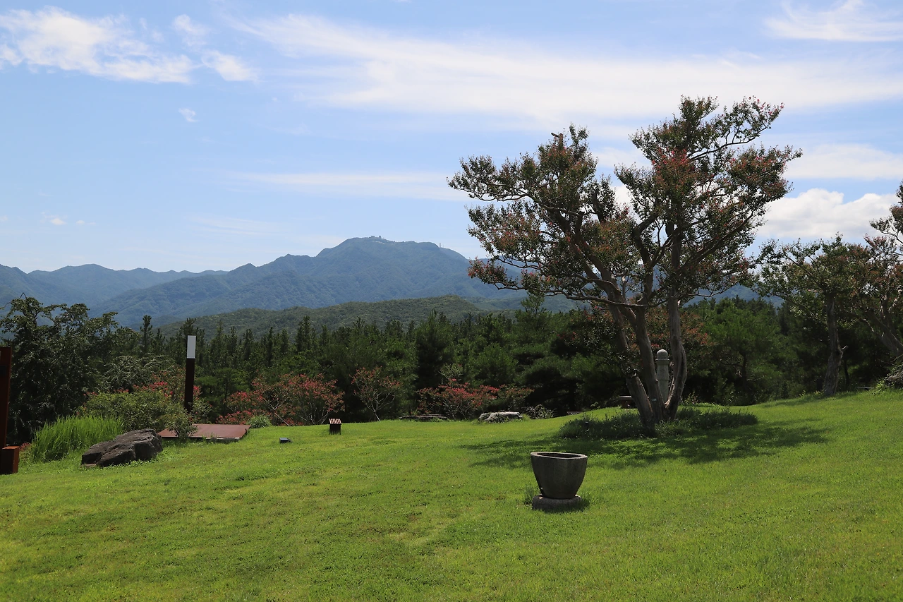 사유원에는 한국 정원도 조성되어 있는데, 넓은 정자 겸 대청마루가 있는 한옥과 연못 그리고 담장이 둘러쳐있는 이곳은 한참 걸으며 피곤해진 몸을 쉬어가기 가장 좋은 곳이었다. 마루에는 올라가서 쉴 수 있는 장소가 있으니 주변의 정겹고 편안한 정원을 보면서 바람을 느끼며 쉬어가는 것이 좋겠다. 이후에도 계속 이곳저곳을 둘러보다 보면 거의 산 정상에 도착하게 된다. 이곳에는 음료와 간단한 먹거리가 있는 카페가 있다. 이 산 정상에 서면 맞은편에 팔공산이 넓게 펼쳐져 보여 시야가 크게 열린다.