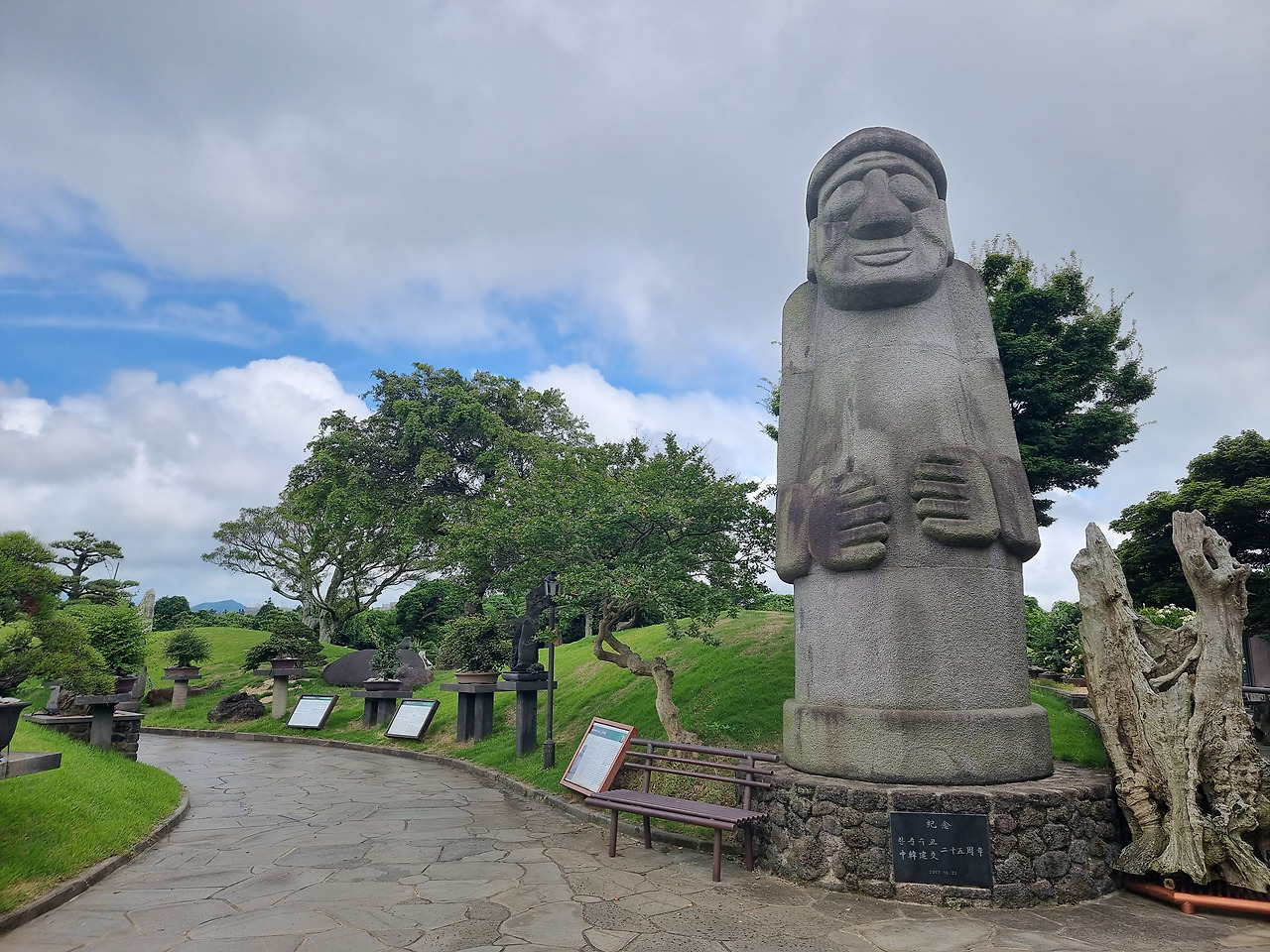 사실 분재에 대한 조예나 안목이 별로 없는 나로서는 이 정원의 아름다움과 놀라움을 충분하게 받아들일 준비가 안 되어 있었지만, 제주에 간 김에 방문해 보기로 했다. 주차장에 도착했는데 별로 차량이 없고, 방문객도 없어 한산한 편이었다. 티켓을 구입하고 정문을 들어서는 순간 왼쪽 편 정원에서 제주 갈옷을 입고 더위도 아랑곳하지 않고 나무를 다듬고 계시는 노인이 계셨다. 살펴보니 언론에서 본 생각하는 정원의 설립자 성범영 선생님이셨다. 가볍게 목례를 드리고 정원에 들어가려고 했더니 다가오시면서 어디에서 왔느냐고 물으시더니 명함을 한 장 주셨다. 인사를 나누고 함께 사진도 찍으며 존경과 즐거운 마음을 안고 정원 탐방을 시작했다.