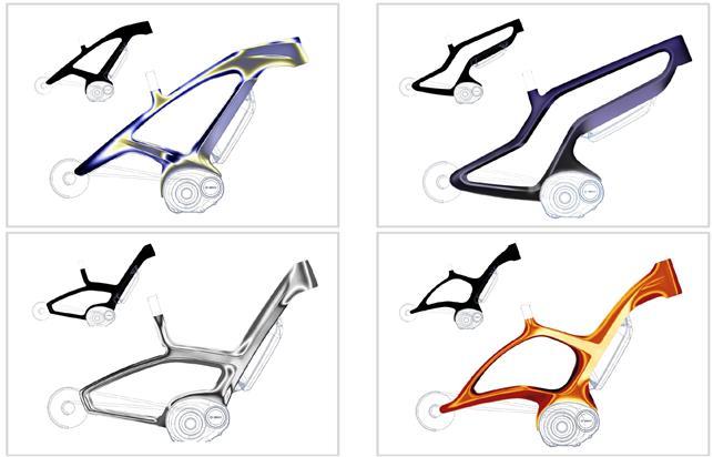 고장력강판은 특수소재로 일반적인 철판보다 인장강도가 월등히 높다. 주로 자동차에서 탑승객을 보호하기 위한 B필러 주변부와 탑승객을 둘러싼 칵핏부위에 사용된다. 구조재는 강한 성질을 보유하므로 금형으로 성형 시 더 많은 압력을 요구하고 금형의 제작 조건 역시 까다로울 수밖에 없다. 일반적으로 자동차 외장 디자인으로 구분되는 외판의 경우 고장력강판 대신 다소 무른 소재를 사용하는데, 이는 디자인 자유도에 따른 성형성을 높이는 것뿐 아니라 외부 충격을 1차적으로 흡수하기 위함이다. 따라서 구조재와 스킨이 구분이 되어 있는 것이 자동차제조 프로세스의 일반적인 방법론이다. 그러나 자전거 프레임은 뼈대와 스킨의 형상이 일체 된 구조로, 이를 Monocoque 또는 Exoskeleton으로 표현하기도 한다. 즉, 성형이 힘든 구조재를 통해 요구되는 강성과 디자인을 동시에 표현해야 하는 것이 일차적인 과제이다.