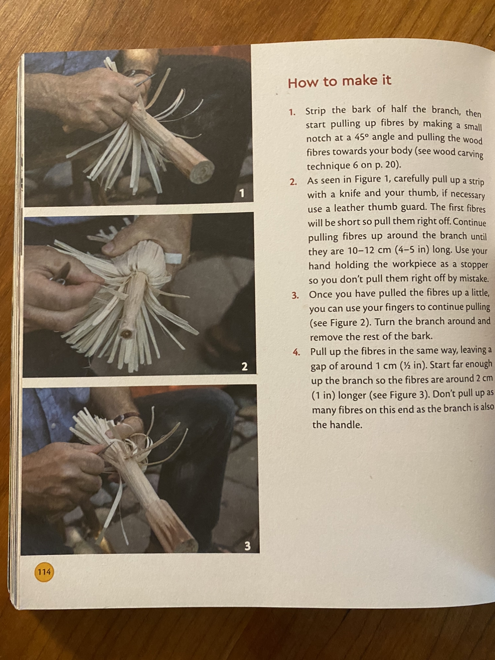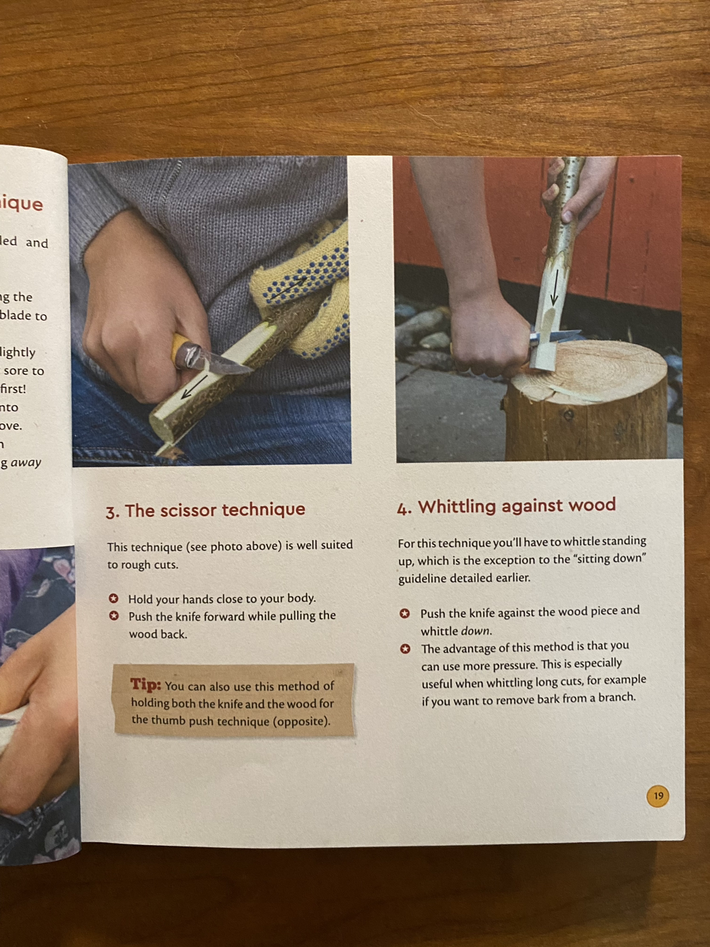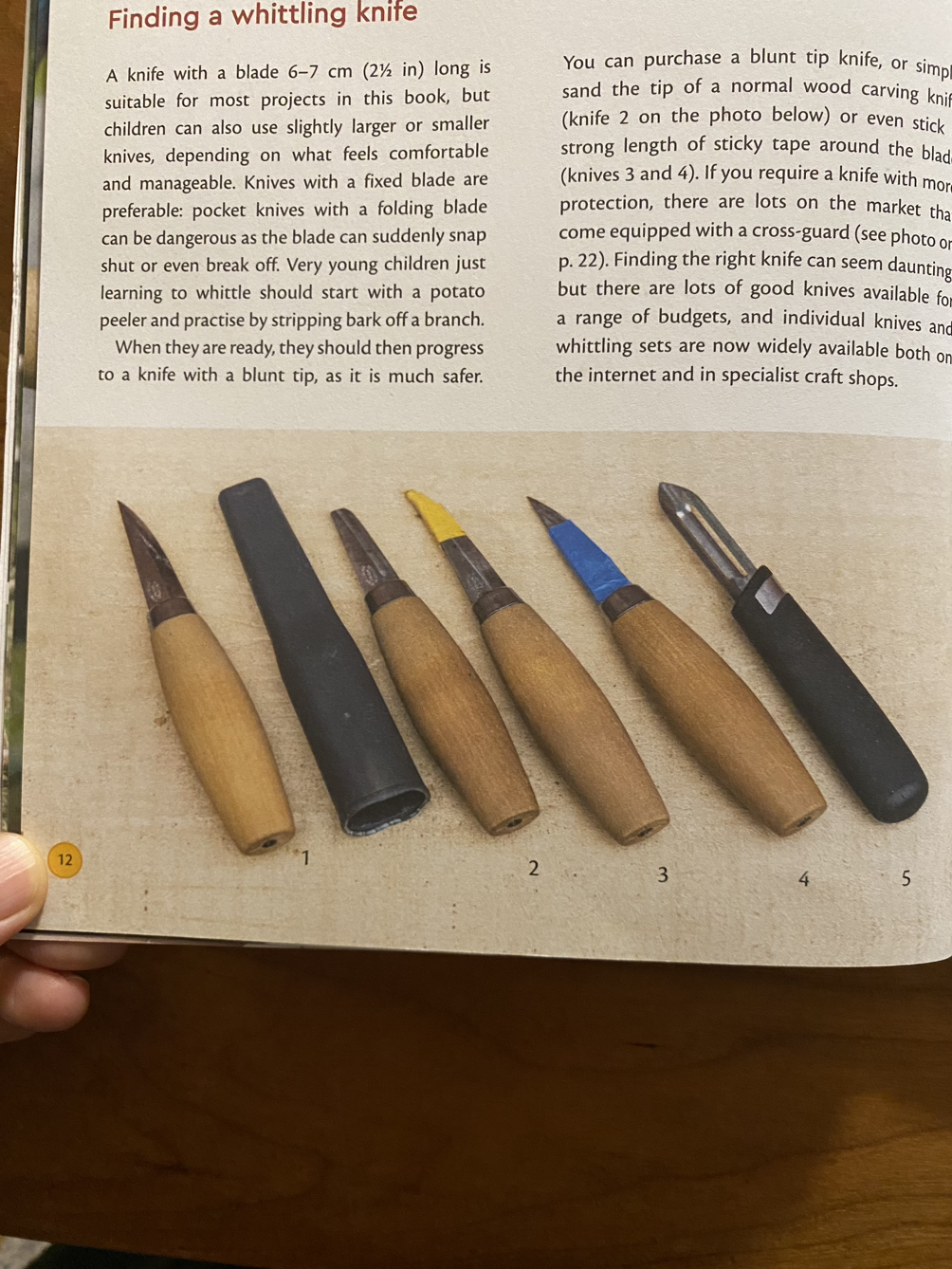 시작하기에 앞서 적절한 칼을 고르는 방법이 나와 있는데 이제 막 배우기 시작한 어린아이들은 감자 필러로 나뭇가지 껍질을 벗기는 것부터 연습하기를 추천하고 있습니다. 그다음은 날 끝이 무딘 나이프나 칼날 일부분을 접착테이프로 감아서 사용하는데 참 괜찮은 방법이네요.