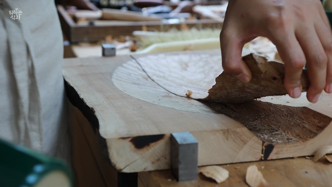 그런데 역시 크랙이 문제였다. 심재 부분은 사용하지 않는 것이 좋다고 어딘가에서 봤던 기억이 떠올랐다. 이미 늦었다. 그 틈으로 끌이 걸려 작업 불가, 목재가 분리되기 일보 직전. 선택은 하나였다. 과감하게 뜯어내고 그 모양대로 살리는 것. 에라 모르겠다. 뜯어내버리자 뜨거운 한숨이 쏟아져 나왔다.