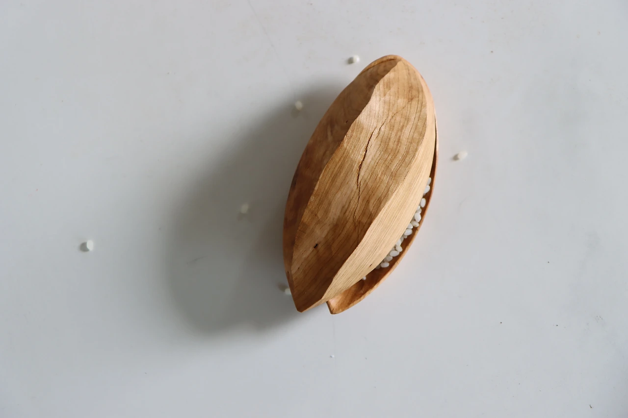 자연물이 띠고 있는 형태는 발 밑에 굴러다니는 돌마저도 이리 보고 저리 보지 않아도 어여쁘다. 한 번도 자세히 본 적 없던 볍씨가 이토록 예쁠 줄이야. 그 선을 따라가며 손 가는 대로 끌질하다 보니 바닥에 내려놓았을 때 오뚝이처럼 한참을 흔들거리다 멈췄다. 네 용도는 무엇일까.