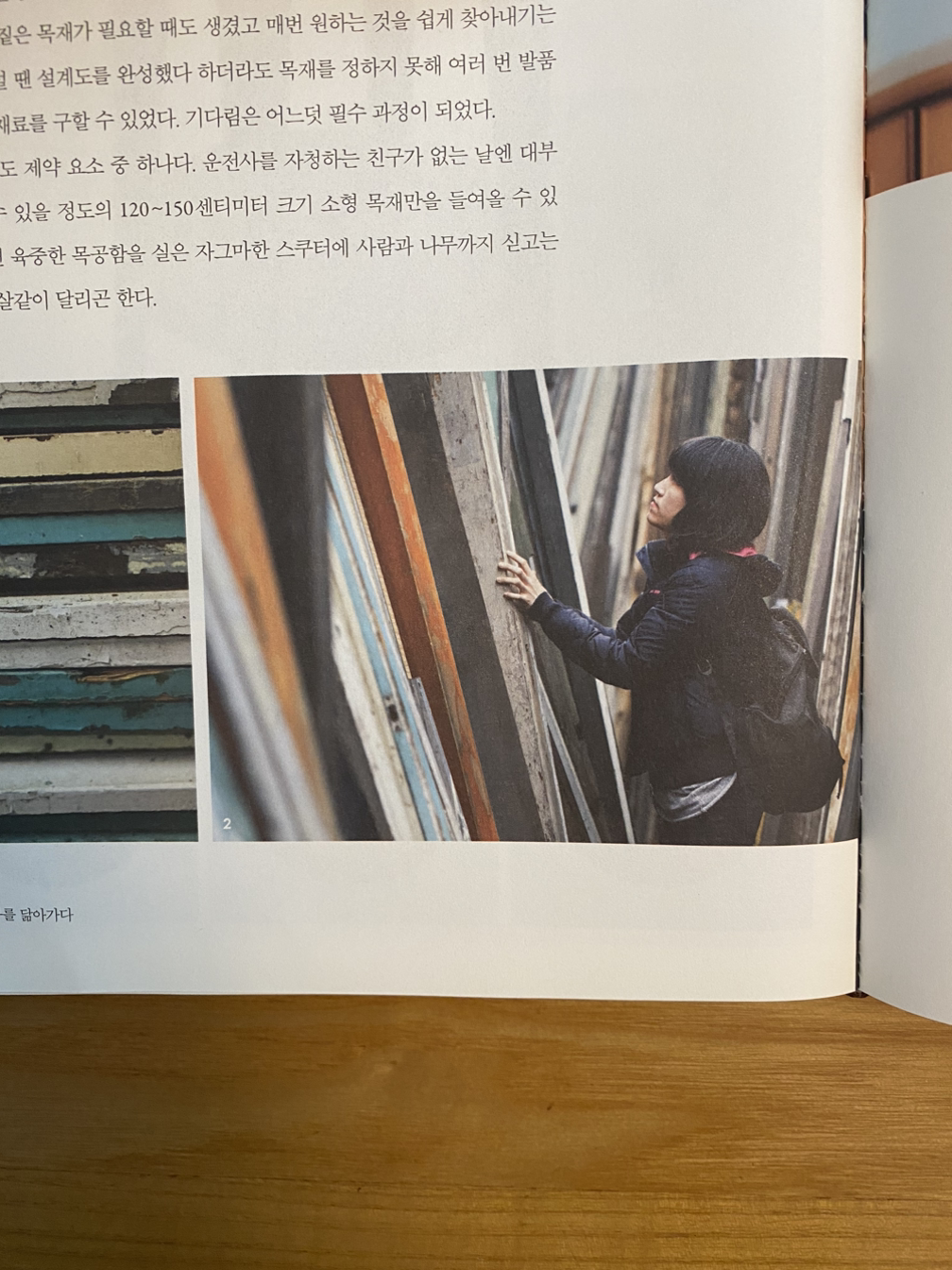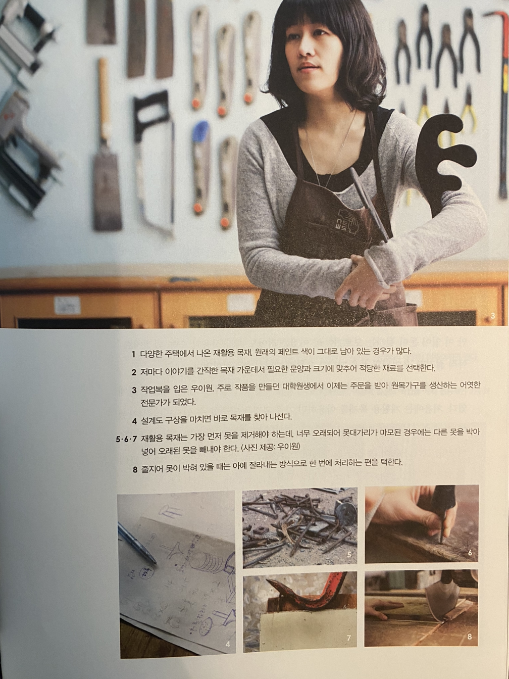 우이원은 재활용 목재에 좀이 쓴 부분을 도려내거나 못을 빼내는 힘든 과정을 거치면서 나무에 대한 감사한 마음을 갖게 되었다고 해요. 그 수고로움마저 나무를 위해 기꺼이 감내할 수 있었던 거죠.