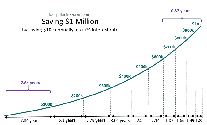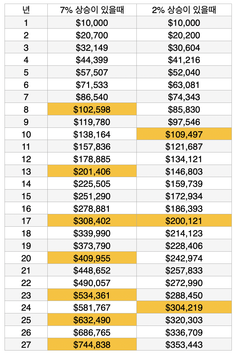 아래의 그래프는 복리투자 시 두 배가 되는 시점이 기하급수적으로 증가되는 것을 보여준다. 10,000 달러(환율 1달러 1000원, 1,000만 원이라 가정)를 매년 투자하고 7%의 이자율이 있을 때를 가정한 것이다.(SP500 주가 30년 평균 상승률과 일치한다.) 10,000달러가 100,000 달러 (1억 원)가 되는 기간이 7.84 년 인 반면 100,000달러가 200,000달러가 되기까지는 5.1년 걸린다. 그리고 900,000 달러 (9억 원)가 1,000,000달러 ( 10억 원) 이 되기까지는 1.39년만 있으면 된다. 돈이 돈을 버는 형태인 것이다.