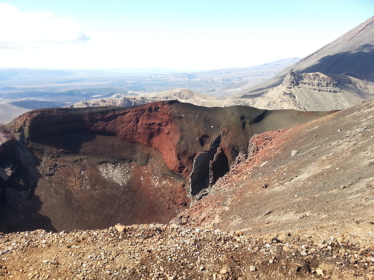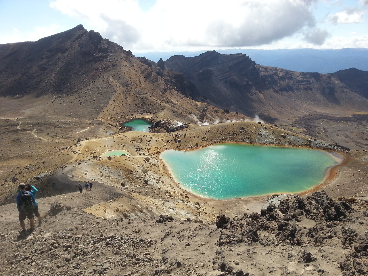 이제 진짜 등산인가 보다. 안내서에도 hard ascent라고 되어있다. 힘들게 보인다. 긴팔 재킷도 벗어버리고 올라간다. 저기만 올라가면 힘든 것은 끝나려나... 안내서를 보니 지금 2번은 hard, 4번은 difficult ascent라고 되어 있다. hard와 difficult가 뭐가 다른 거야.. 뭐가 더 힘들다는 거지??? 어쨌든 다시 보기 힘든 활화산 구역을 걸었다. 화산의 색깔이 참 이쁘다. 이 구역을 지나니 평탄한 지역이 나온다. 멀리 사람들이 쉬고 있는 곳이 보이고 Red crater ridge라는 곳까지 올라가는 사람이 보인다. 바로 이 지역이 difficult ascent인데 정말 어렵다. 작은 자갈과 모래로 올라가기가 어렵다. 음... 이제 hard와 difficult가 구분이 된다. 힘껏 오르니 아이고 아래에 에메랄드 호수가 보이기는 하는데 내려갈 일이 큰일이다. easy descent 가 아니고 difficult다 거의 45도 이상의 경사면을 미끄러지듯이 내려가야 한다. 15분이라는데 무슨.... 멀리 보이는 호수가 정말 이쁘다... 어렵게 내려와 보니 여기는 연기가 피어오르는 활화산 지대다... 뭐 혹시라도 사이렌이 울리면 빨리 이 구역을 벗어나란다.... 화산이 폭발한다고... 이런...~~