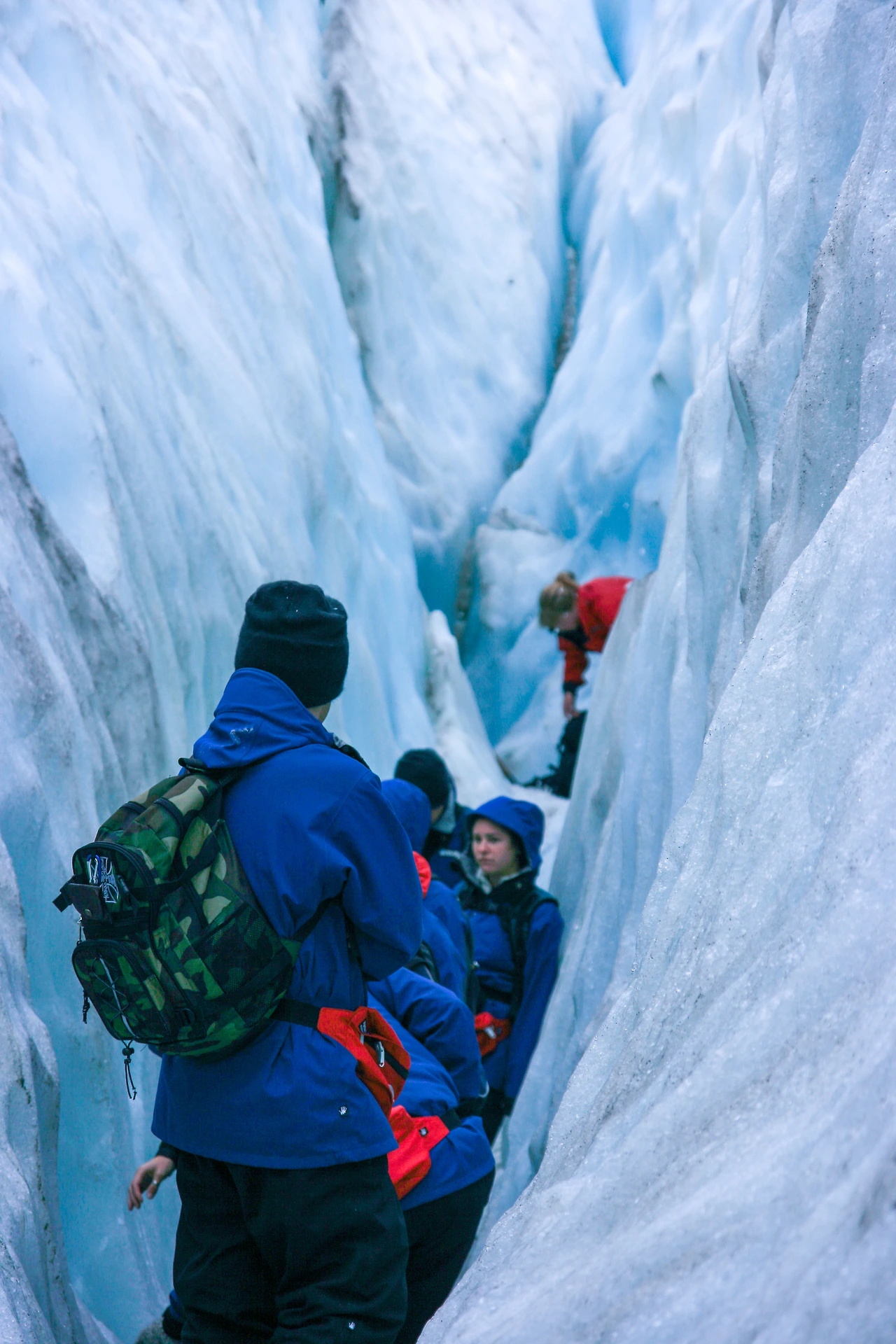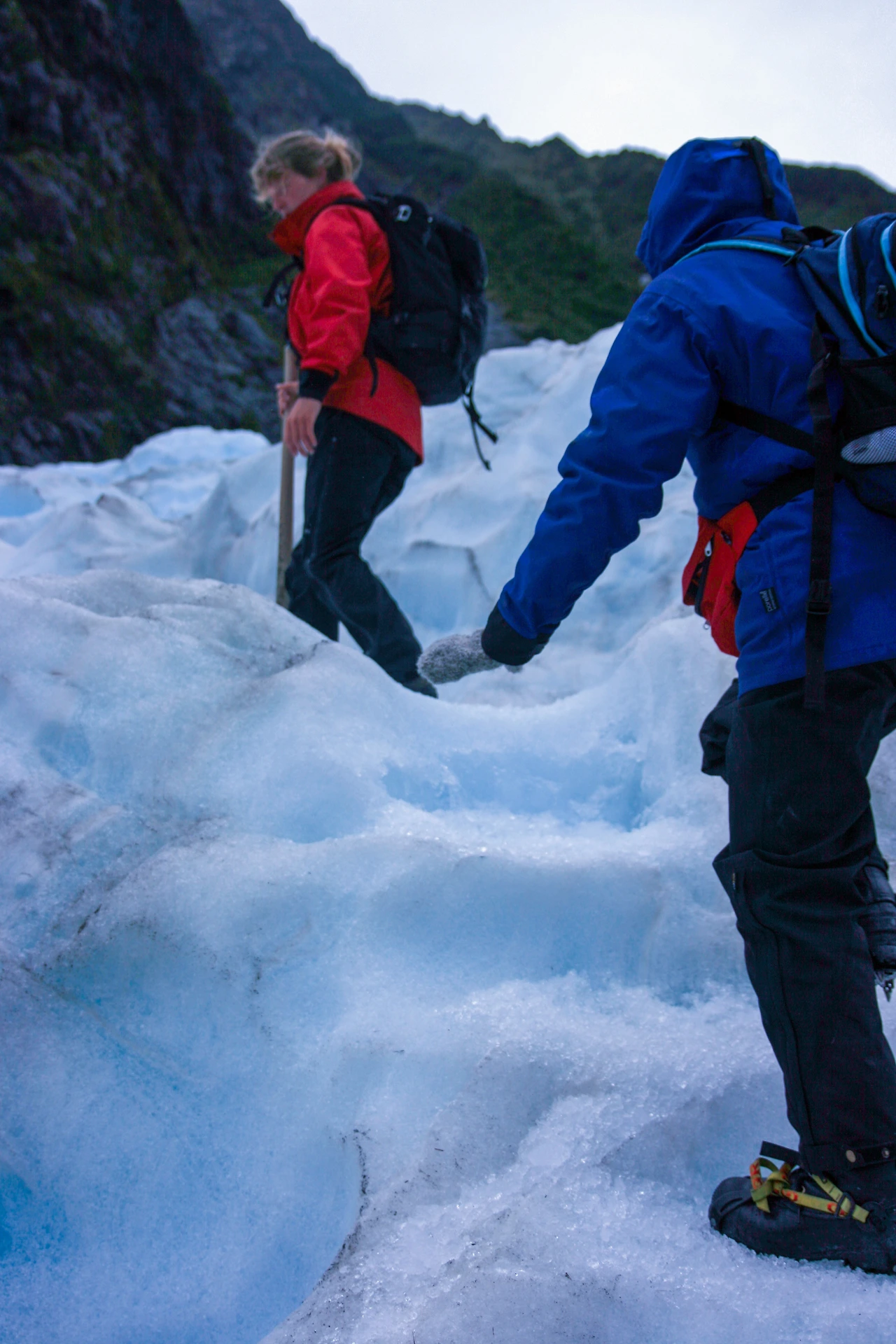 캣의 말대로 조금 더 올라가자 확실히 처음과 비교해서도 훨씬 깨끗한 빙하가 나타나기 시작했다. 캣은 계속해서 큰 곡괭이를 들고 쉴 새 없이 빙하를 부수고 다듬으며 계단처럼 만들어놓아 우리가 편하고 안전하게 빙하탐험을 할 수 있게 도와주었다. 중간중간 낭떠러지인 듯 깊게 파인 곳도 있고 빙하가 살짝 녹아 물처럼 흐르는 곳도 있었는데 조금 더 올라가다 보니 일기 예보대로 서서히 비가 내리기 시작했다. 방수처리가 된 탐험복이라 젖을 리는 없었지만 안 그래도 빙하에 둘러싸여 추웠는데 비까지 내려 더 힘들게 느껴졌다. 시간이 갈수록 다리도 점점 무거워지는 것을 느꼈지만 뒤처지지 않고 내색하지 않으려고 악착같이 캣의 뒤를 쫓아갔다.