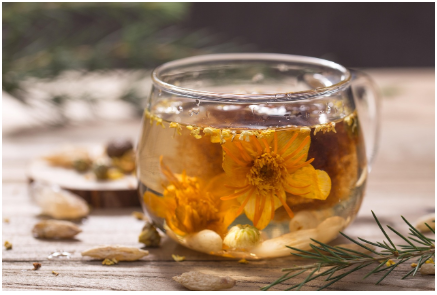 투명한 찻잔 속, 동그랗게 말린 꽃잎이 물을 만나 천천히 펼쳐집니다.