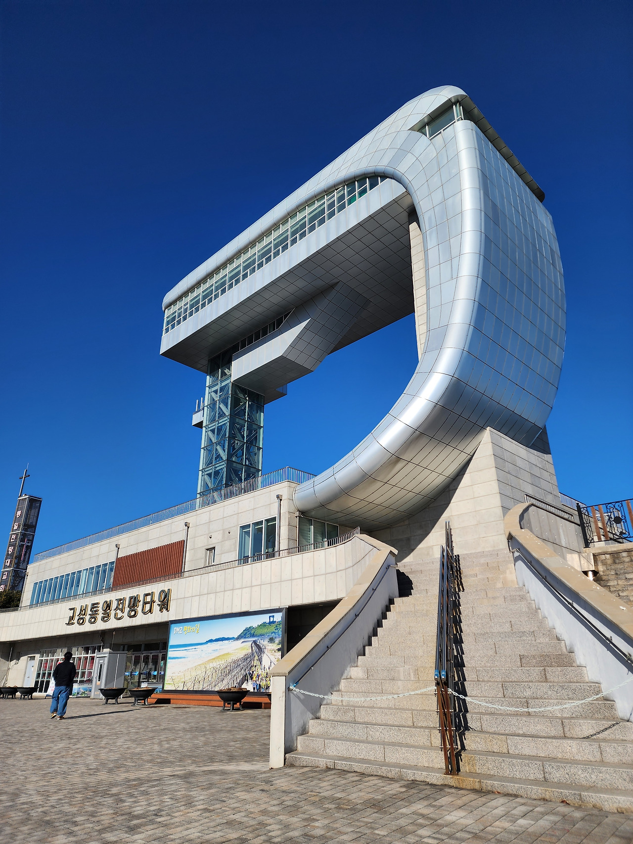 전망대는 DMZ(Demilitarized Zone)의 D 모양을 하고 있습니다. 아무도 들어갈 수 없는 비무장지대에는 희귀한 동식물이 많다고 해요. 생명의 천국 같은 곳임에도 한국전쟁 때 설치한 지뢰가 아직 남아있어요. 덩치가 큰 동물의 목숨을 한순간에 앗아가기도 하죠. 겉으로는 조화로워 보이지만 위험이 도사리고 있는 게 꼭 우리나라와 닮았어요. 평소에는 아무렇지 않다가 날아오는 오물풍선과 삐라에 신경을 곤두세우는 모습처럼요.