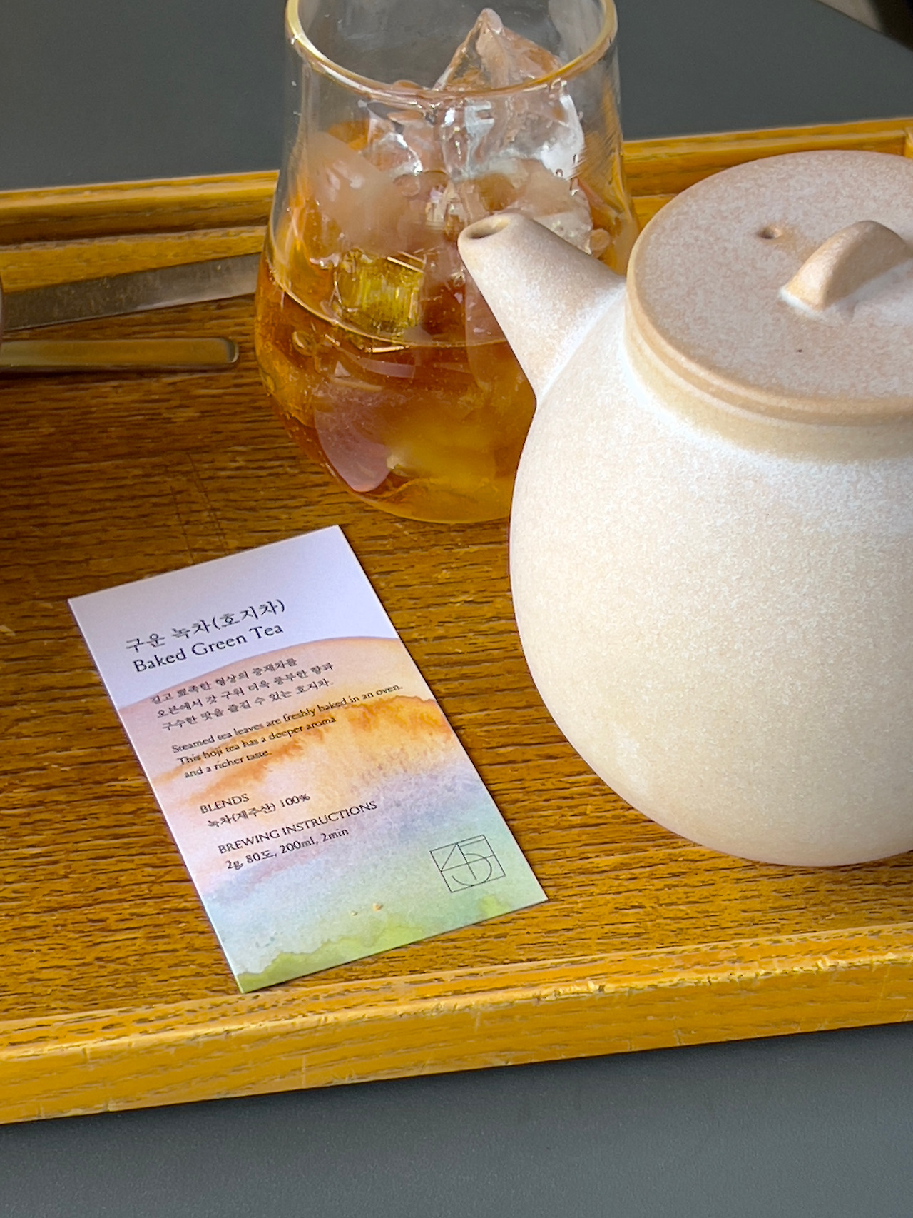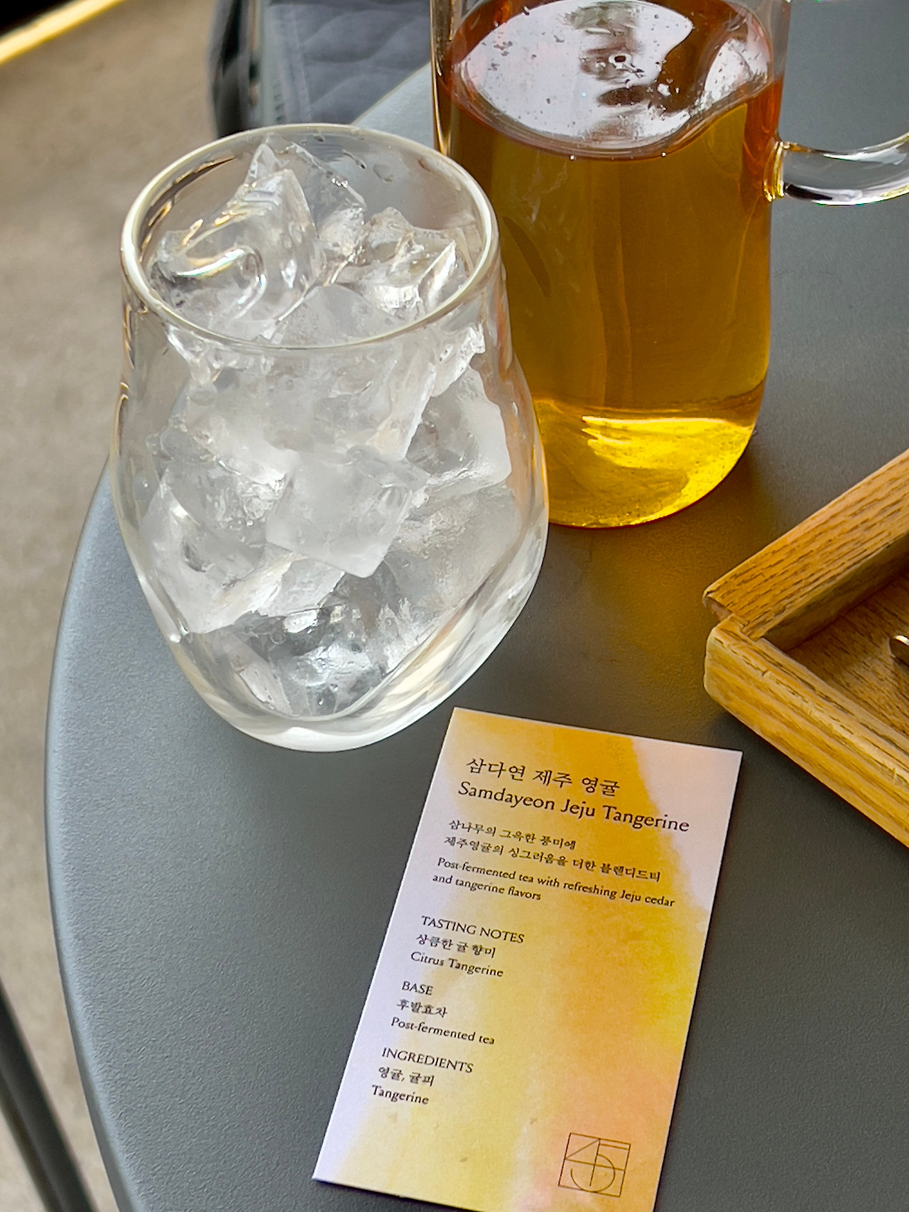 2. 벽의 소재와 색감은 제주스러운 집과 같았고, 차를 시켰을 때 나오는 설명지 등은 한지 위에 퍼진 맑은 수채화 같았다. 살짝 탁하면서 중채도인 색감들이 더 한국의 정체성을 반영하고 있었다.