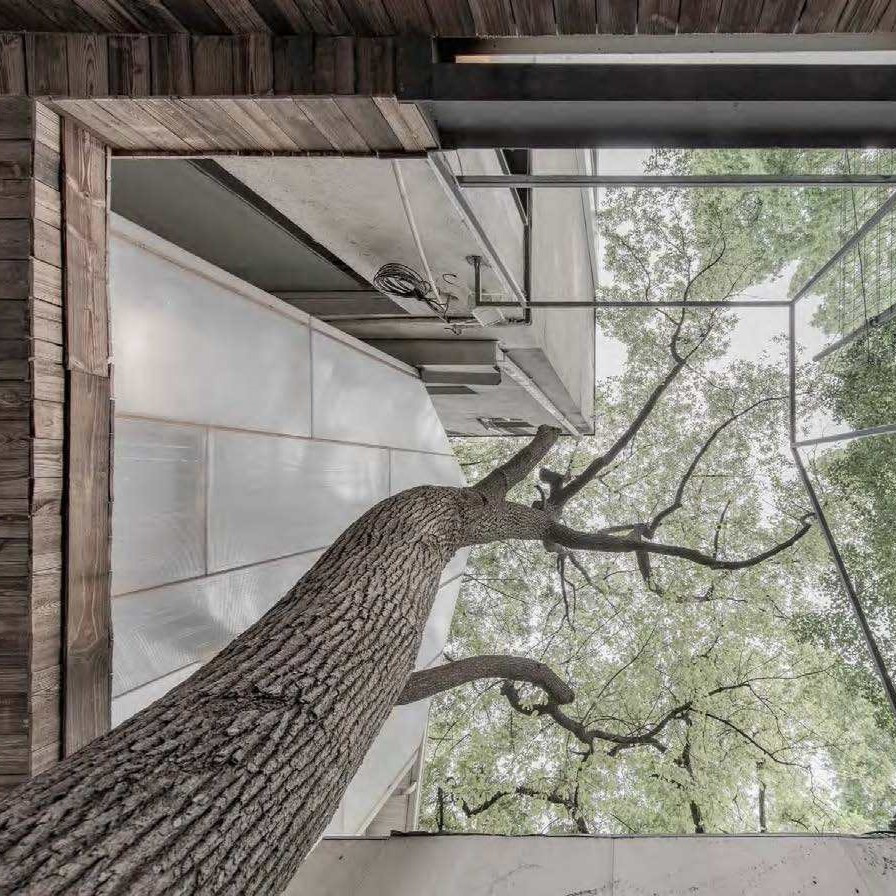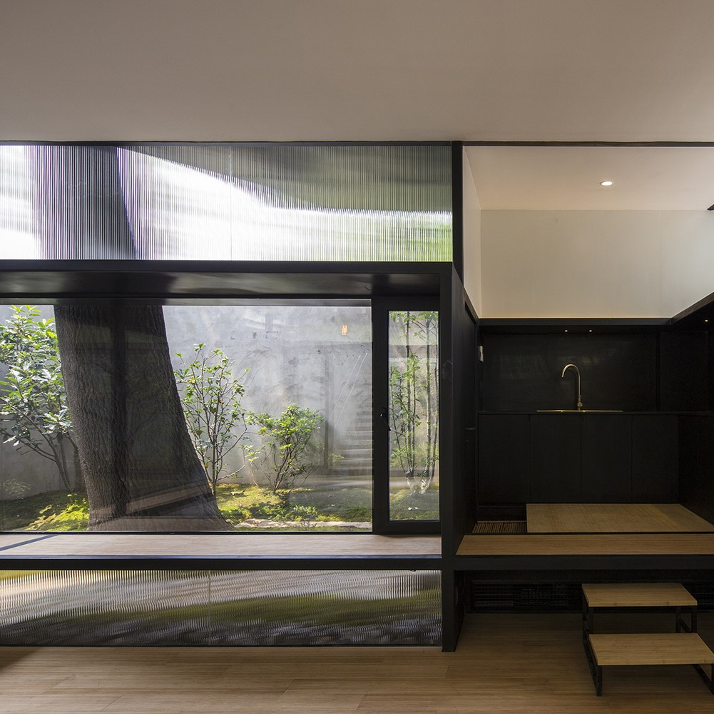 # 건물 전체를 덮을 정도로 큰 오동나무가 집 뒤쪽 좁은 곳에서 자라고 있었다. 오동나무가 침묵하며 지내면서 집까지도 함께 침묵했다. 이렇게 있던 구석 공간을 안뜰로 바꾸면서 오동나무가 집 뒤쪽 어두운 곳에서 밝은 곳으로 나올 수 있게 되었다. 오동나무가 집의 중심이 된 것이다. 이렇게 유니크한 공간이 탄생하면서 잠자고 있던 지름 90cm의 오동나무가 집과 함께 다시 활력을 얻게 되었다. 하마터면 잊히면서 쓸쓸함으로 기억될 뻔했던 오동나무를 푸른 기풍과 따뜻함으로 날마다 대할 수 있게 바꾸어 놓았다. 이렇게 지어진 집에서는 시간이 흐르고 나이가 들어도 오동나무가 편안히 우리를 쉬게 하고 지켜줄 것 같다. @ 중국 리가든 티하우스 by 아틀리에 데스하우스 2017 (Tea House in Li Garden by Atelier Deshaus)