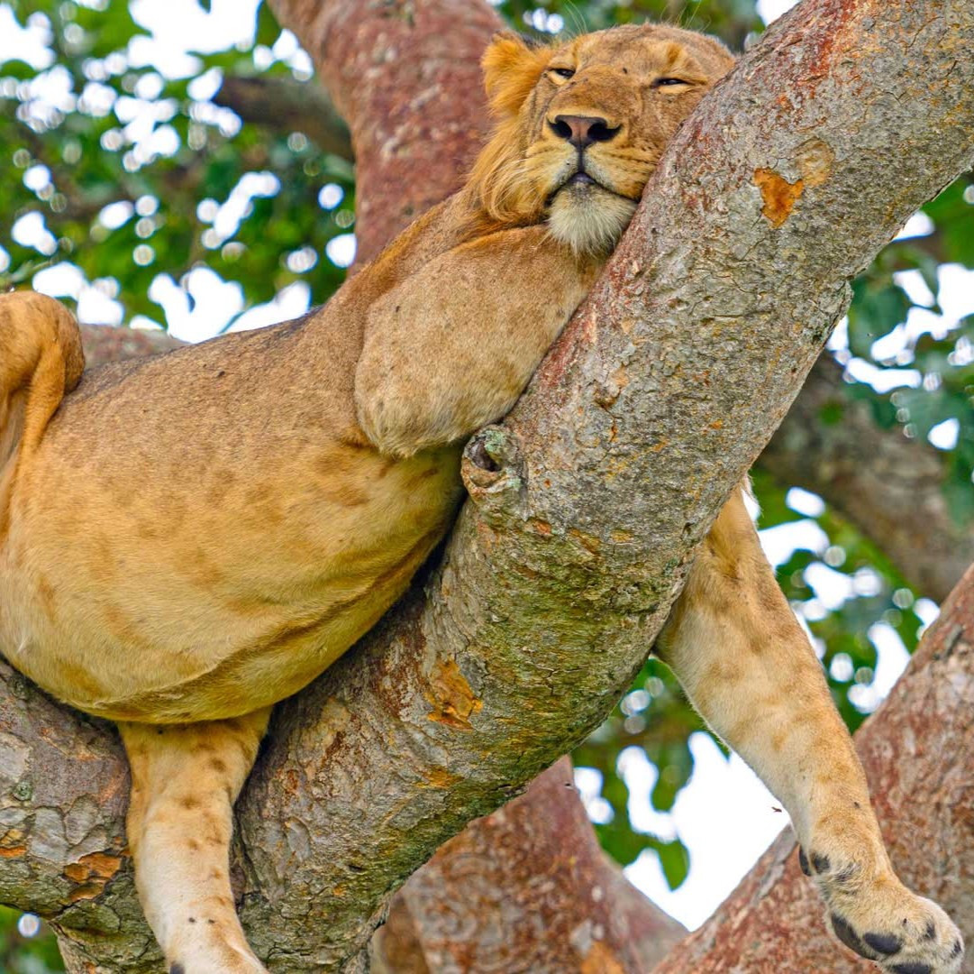 # 백수의 왕으로 불리는 사자는 사바나의 초원을 누비며 생활한다. 이렇게 빠르고 활기찬 사자라 할지라도 항상 혹독한 경쟁을 치러야 한다. 사자들은 수풀에서 잠복하여 사냥을 하기도 하고 나무 그늘 아래서 휴식을 취하기도 한다. 그리나 퀸 엘리자베스 국립공원의 사자들은 침입자들의 공격을 피해 버스의 뒷좌석과도 같은 나무 위에서 시간을 보낸다. 우기 기간 동안 이들 사자에게 가장 좋은 쉼터가 되는 곳은 아카시아와 시카모어 나무의 가지이다. 이것은 분명 이 높은 곳까지 오르는 아찔함을 경험하고 나서야 얻을 수 있는 휴식이고 행복일 것이다. 이 또한 빗속을 통과하고 나서 만나게 되는 것들이다. @우간다 퀸 엘리자베스 국립공원 (Queen Elizabeth National Park, Uganda)