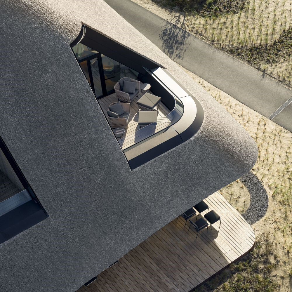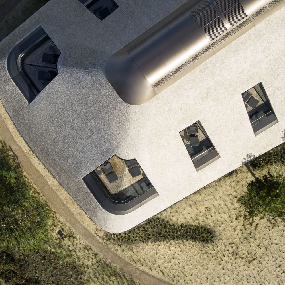 # 사막의 모래 사구는 바람에 따라 모습을 바꿔가며 천천히 움직인다. 이렇게 시간과 함께 만들어진 움푹한 풍경은 편안한 자연의 모습을 하고 있다. 공간 역시도 이렇게 시간을 두고 만들어지고 다듬어질 때 깊이를 가질 수 있게 된다. 이렇게 만들어진 건축은 실내 크기에 꼭 맞는 외관을 가지게 되면서 평온함을 내부와 외부에서 느낄 수 있다. 모래 사구가 내려 앉은 듯한 공간은 우주선 같은 황홀함을 가지고 있다. 그래서 이곳에서 하늘을 올려다보면 우주에서 지구를 내려보는 듯한 기분을 느낄 수 있다. 그래서인지 여기에 앉아 있으면 시웅~하고 하늘을 나르는 소리가 들릴 것 같다. @독일 란서호프 실트 헬스 리조트 by 인제호벤 어소시어트 2022 (Lanserhof Sylt Health Resort by Ingenhoven associates)