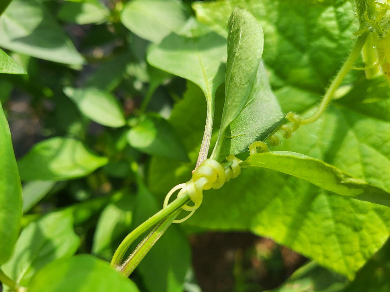 특히 오이가 우후죽순 가지를 뻗어 어디가 원래 순인지 어떤것이 곁에서 난 순인지 도통 알수가 없을 정도로 영켜있다. 뿐만아니라 오이 줄기에 있는 넝쿨손 녀석들이 바로 옆에 있는 고추의 가지에 슬며시 접근하여 주리를 트는 광경이 곳곳에서 목격됐다.