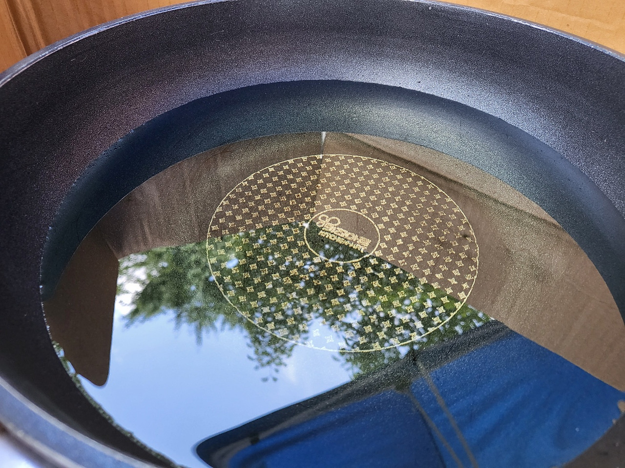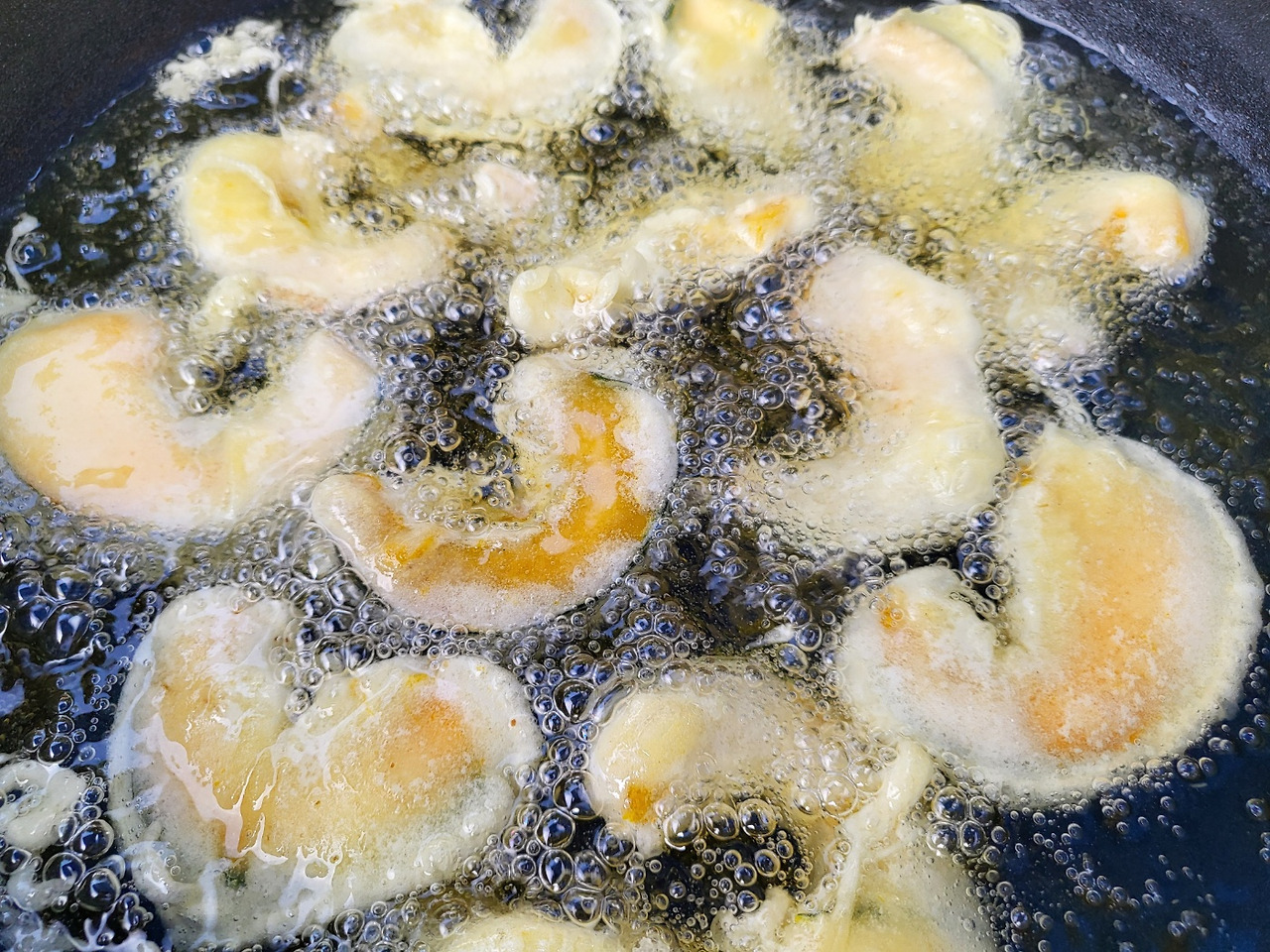 단호박 튀김 프라이팬 속 콩기름에 비치는 하늘은