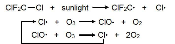 염소 라디칼 원자는 오존층의 오존(O₃)과 반응하여 일산화 염소(ClO)를 만들고, 이 일산화 염소는 다시 오존과 반응하며 결국 2개의 오존이 3개의 산소 분자(O₂)로 분해된다. 문제는 이 과정에서 다시 염소 라디칼 원자가 생성되며 이 반응이 연쇄적으로 일어난다는 것이다. 이 과정이 끝날 때까지 염소 라디칼 원자는 결론적으로 소모되지 않는다. 물론 이 반응에도 여러 가지 제약이 걸리는 이유로 끝이 나겠지만, 염소 원자 하나가 대략 10만 개의 오존 분자를 산소 분자로 바꾸는 식으로 파괴한다는 사실은 놀랍다.