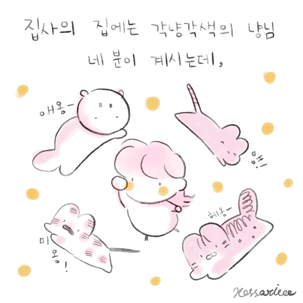 냥이와 집사의 포근한 동화 속으로 초대합니다.🌷 터키시 앙고라 단모인 찹쌀이, 러시안 블루 앙꼬, 코리안 숏헤어 고등어 쿠키. 길에서 만난 묘연으로 집사가 된 작가.