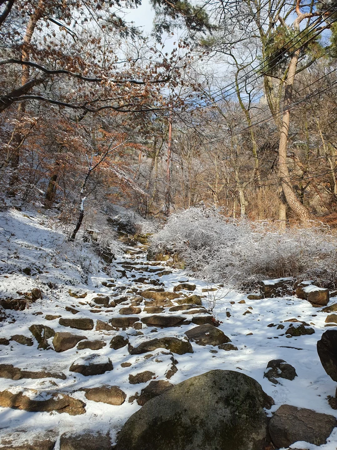 아무도 안 밟았던 새하얀 눈길을 밟을 때는, 나만의 흔적을 남긴다는 생각에 묘한 짜릿함이 느껴집니다. 많은 이들이 밟아서 조금 거뭇해진 눈길을 밟을 때는, 미끄러울까 걱정됐던 곳을 마음 놓고 밟아도 되겠다는 생각에 조금의 안정감이 느껴집니다. 짜릿함과 안정감을 한곳에서 느낄 수 있다니, 이것이 등산의 매력이 아닐까요?