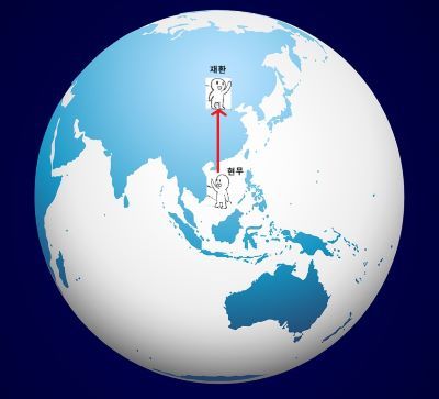 위 그림처럼 자전하지 않는 지구에서 적도 부근에 있는 현무가 중위도에 있는 재환이에게 공을 던지면 직선으로 올라간다.
