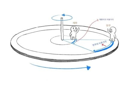 재환이는 원판 안쪽에 현무는 원판 바깥쪽에 있다. 그림처럼 원판이 회전하면 안쪽에 있는 재환이보다 현무가 훨씬 먼 거리를 이동한다.
