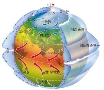 적도를 경계로 지구 북반구와 남반구에서 일어나는 대기대순환 메커니즘은 동일하다. 북반구를 중심으로 대기대순환을 알아보자.