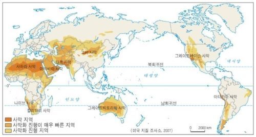 적도를 중심으로 북반구와 남반구의 중위도 지역에 주로 사막이 있다. 이 지역이 적도 인근에서 발생한 편동풍이 편서풍을 만나 오른쪽으로 휘어지면서 형성된 고기압 때문이다. 고기압을 중심으로 오른쪽으로 바람이 불어 나간다. 고기압에서는 하강기류가 발달하여 비가 내리지 않기에 건조하여 사막이 된 것이다.