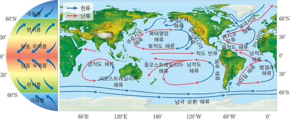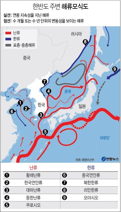 ⇒ 표층해류에는 두 종류가 있다. 저위도에서 고위도로 흐르는 따뜻한 해류인 난류와 고위도에서 저위도로 흐르는 찬 해류인 한류다. 위 그림에서와 같이 우리나라 동해로는 동안 난류가 흐르고, 서해는 황해 난류가 흐른다. 당연히 표층수온은 동해가 더 높다.