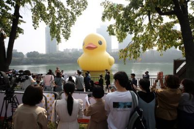 2014년 가을 귀여움으로 무장한 노란 오리 한 마리가 대한민국을 행복하게 했다. 아기가 목욕할 때 가지고 노는 장난감처럼 생긴 고무 오리가, 서울의 강남 한복판에 있는 석촌호수에 둥둥 떠다녔다. 푸른 호수 위에 떠 있는 노란 오리는 멀리서도 눈에 확 띄어 인기가 많았다. 몸통은 노란색에 눈은 새까맣고 부리는 주황색의 앙증맞은 오리는 가로 16.5미터, 세로 19.2미터, 높이 16.5미터로 무게만 자그마치 1톤가량 되었다.