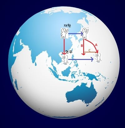회전하는 지구에서 현무가 재환이에게 공을 던지면 B지점으로 날아간다.