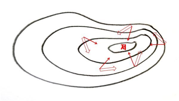 전향력이 없을 시 저기압으로 불어들어가는 풍향
