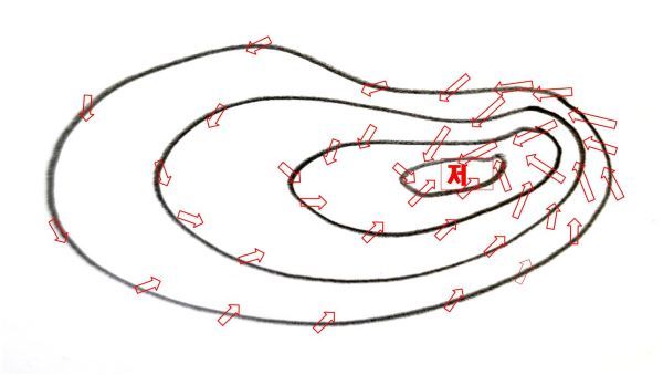 고기압과 저기압은 상대적이다. 옆에 고기압이 있으면 반드시 저기압이 있다. 고기압과 저기압은 붙어다닌다. 그리고 항상 고기압에서 저기압으로 바람이 분다. 만약에 전향력이 없다면 바람의 방향은 고기압에서 저기압으로 곧장 불어 들어온다.