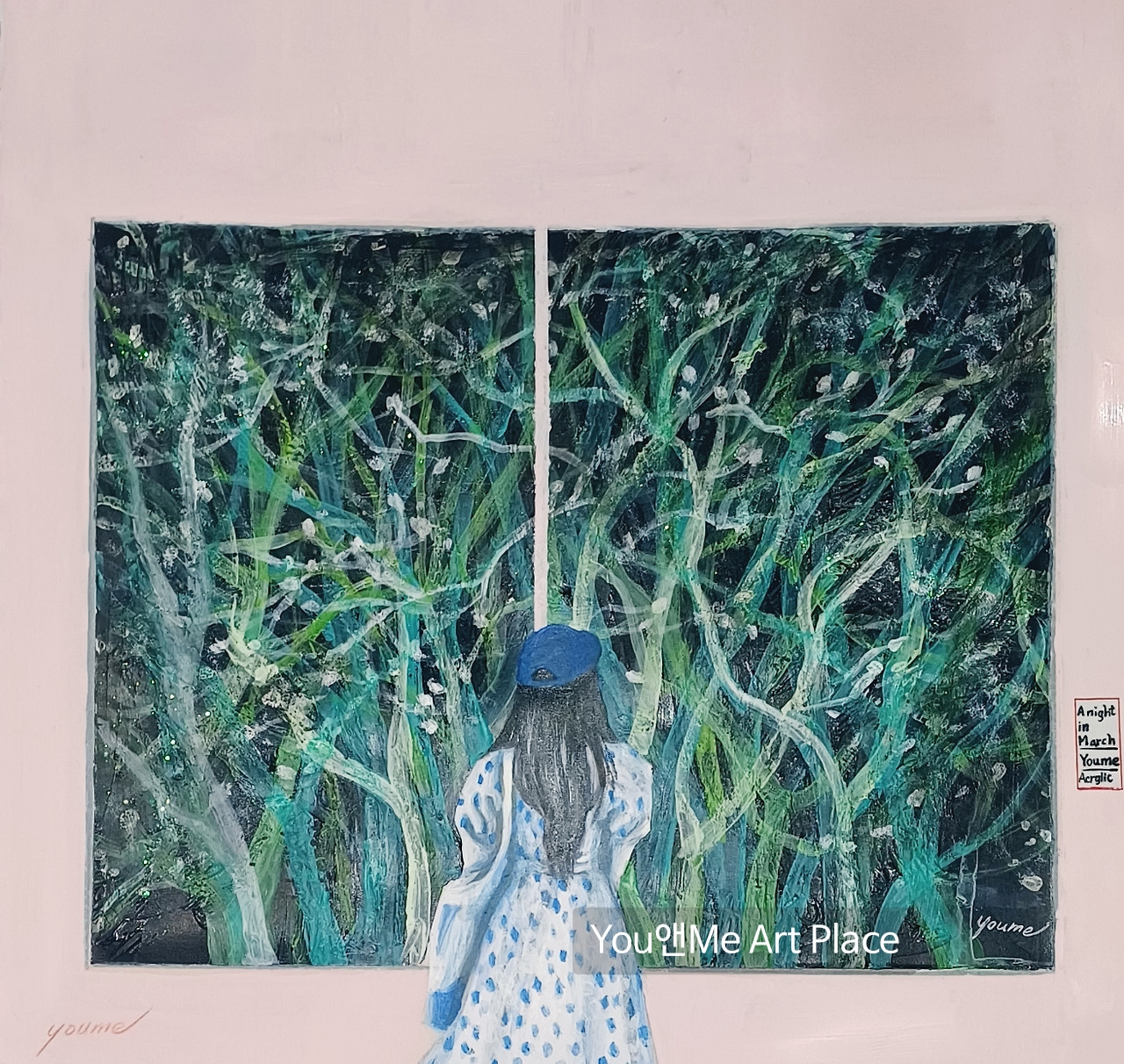 짙은 밤 뒤로 빛나는 연둣빛 나무들이