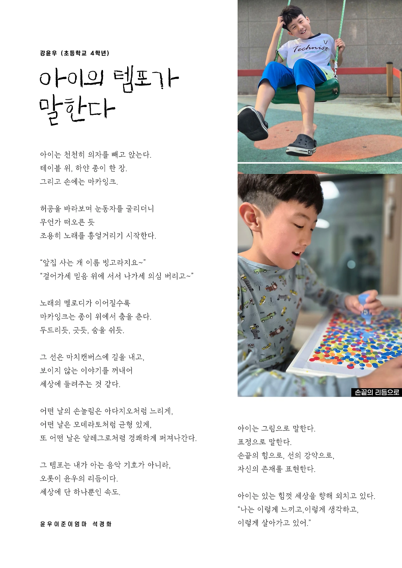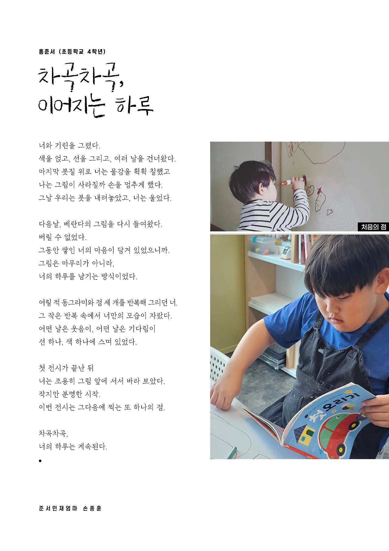 어머니들과의 소통 가운데 언제 끼어들고 언제 빠져야 할지를 멀리서 지켜보며 고민하고 어린 작가들을 응원하고 기도하며 이 과정 자체를 통해 빛날것이 빛나고 드러날 것이 드러나길 바랬다. 그 귀한 과정들을 겪으며 우리 모두는 막연함을 넘어 성장했고 이제 또다른 이들과 나누고자 한다.