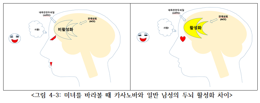 뇌과학적 관점에서 볼 때, 일반적인 남성과 달리 카사노바는 미녀를 바라볼 때 특정 두뇌 영역이 충분히 활성화되지 않을 가능성이 크다. 대표적인 부위가 바로 내측전전두피질(medial prefrontal cortex, mPFC)과 전대상회(anterior cingulate cortex, ACC)다. 이 두 영역은 타인의 감정과 고통을 이해하고 공감하는 데 중요한 역할을 한다.