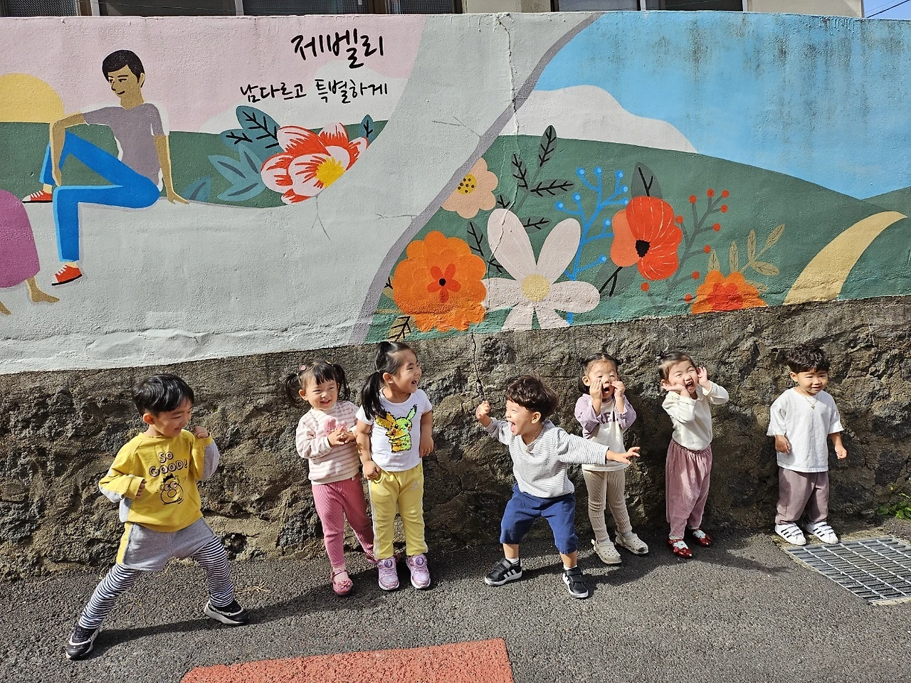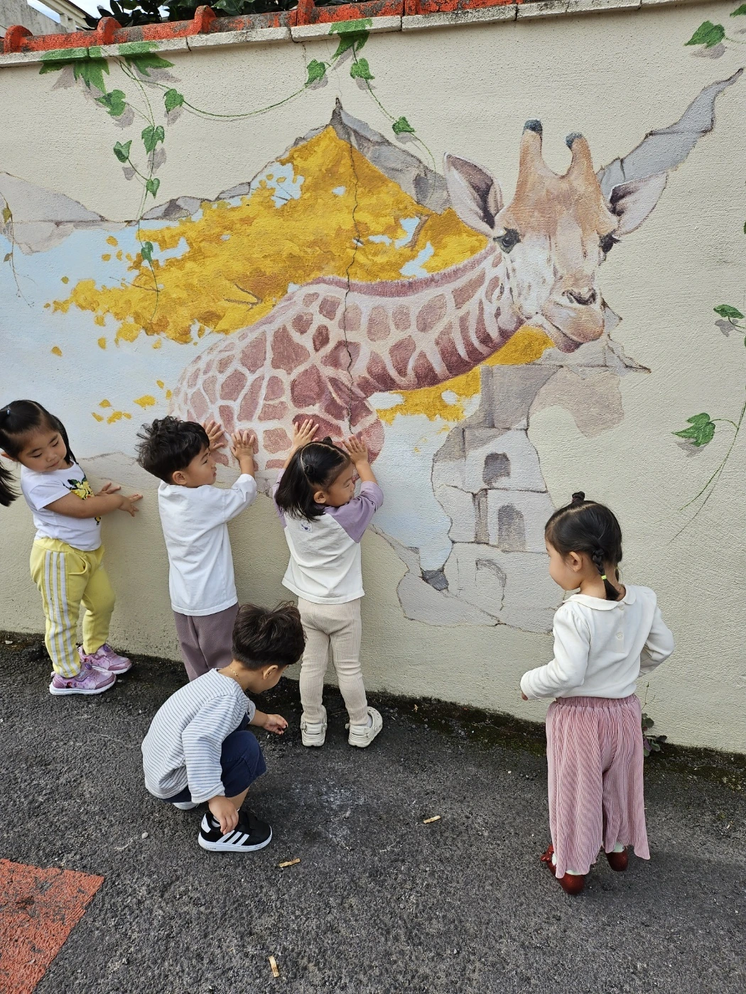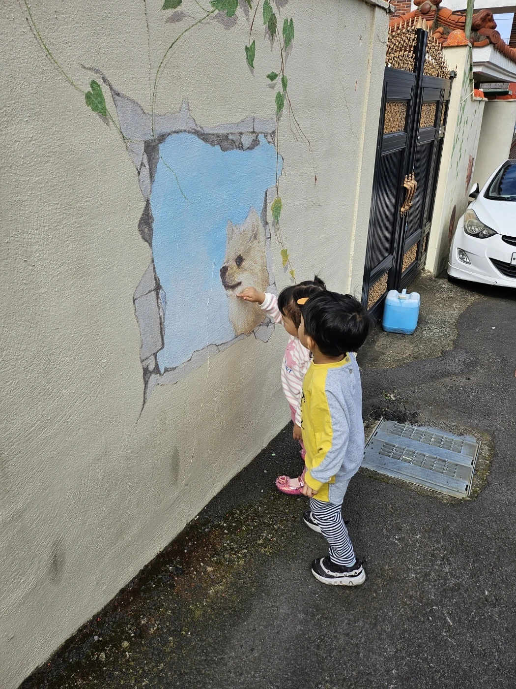 벽화를 하나하나 손으로 짚으며 “어, 여기 고양이 있어요!”하며 웃는 아이들.