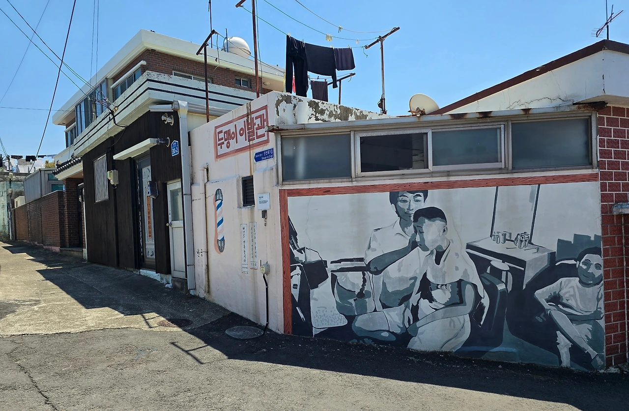두맹이골목을 걷다가 ‘두맹이이발관’ 벽화 앞에 멈춰 섰다. 그림 속 꼬마 아이의 표정이 마치 오래전 우리 집 풍경을 닮아 있어 웃음이 나왔다.