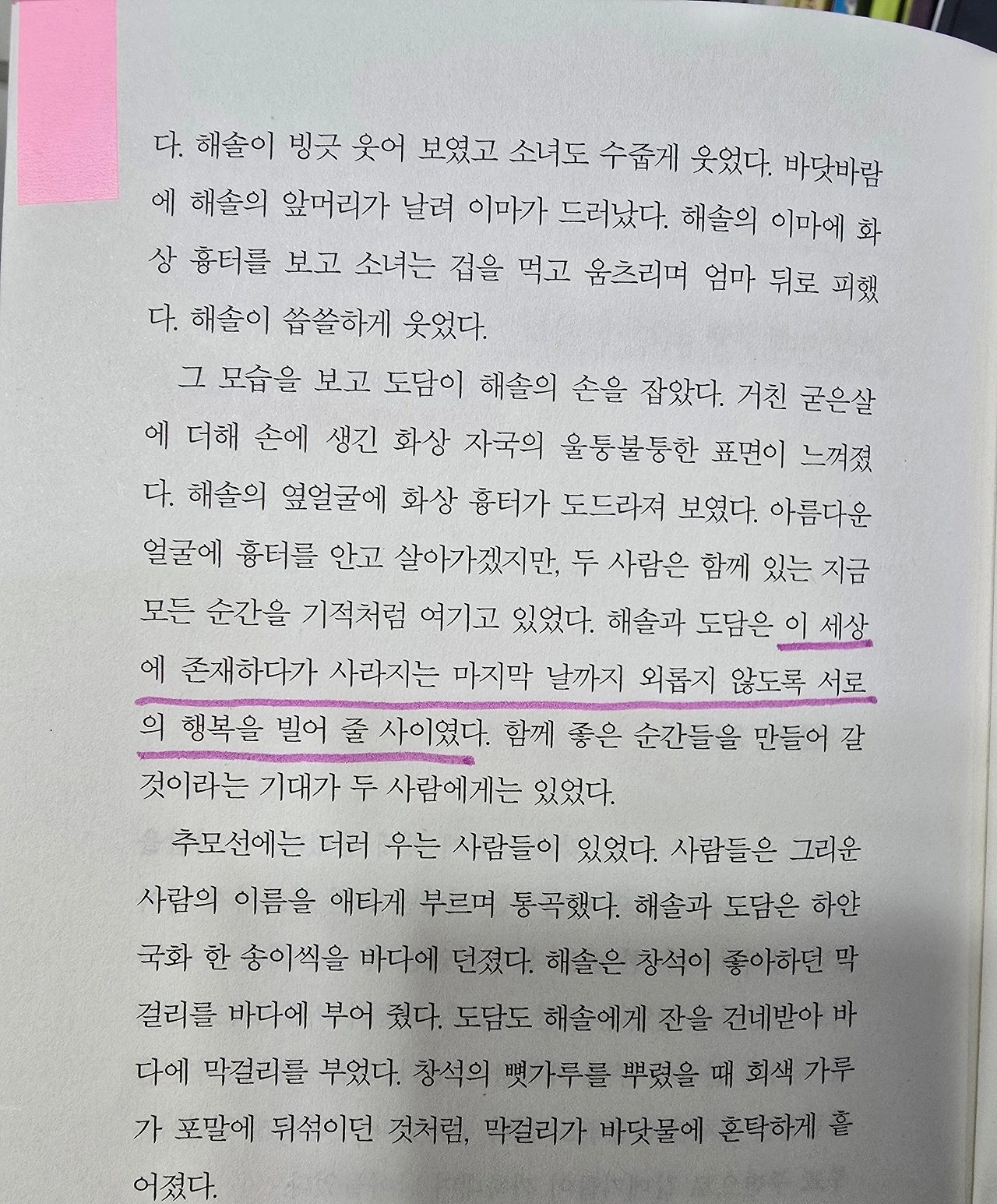 “해솔과 도담은 이 세상에 존재하다가 사라지는 마지막 날까지 외롭지 않도록 서로의 행복을 빌어 줄 사이였다.”
