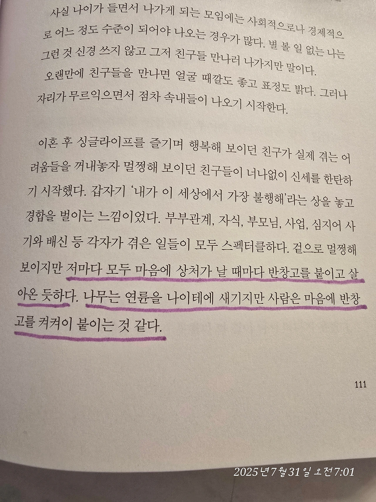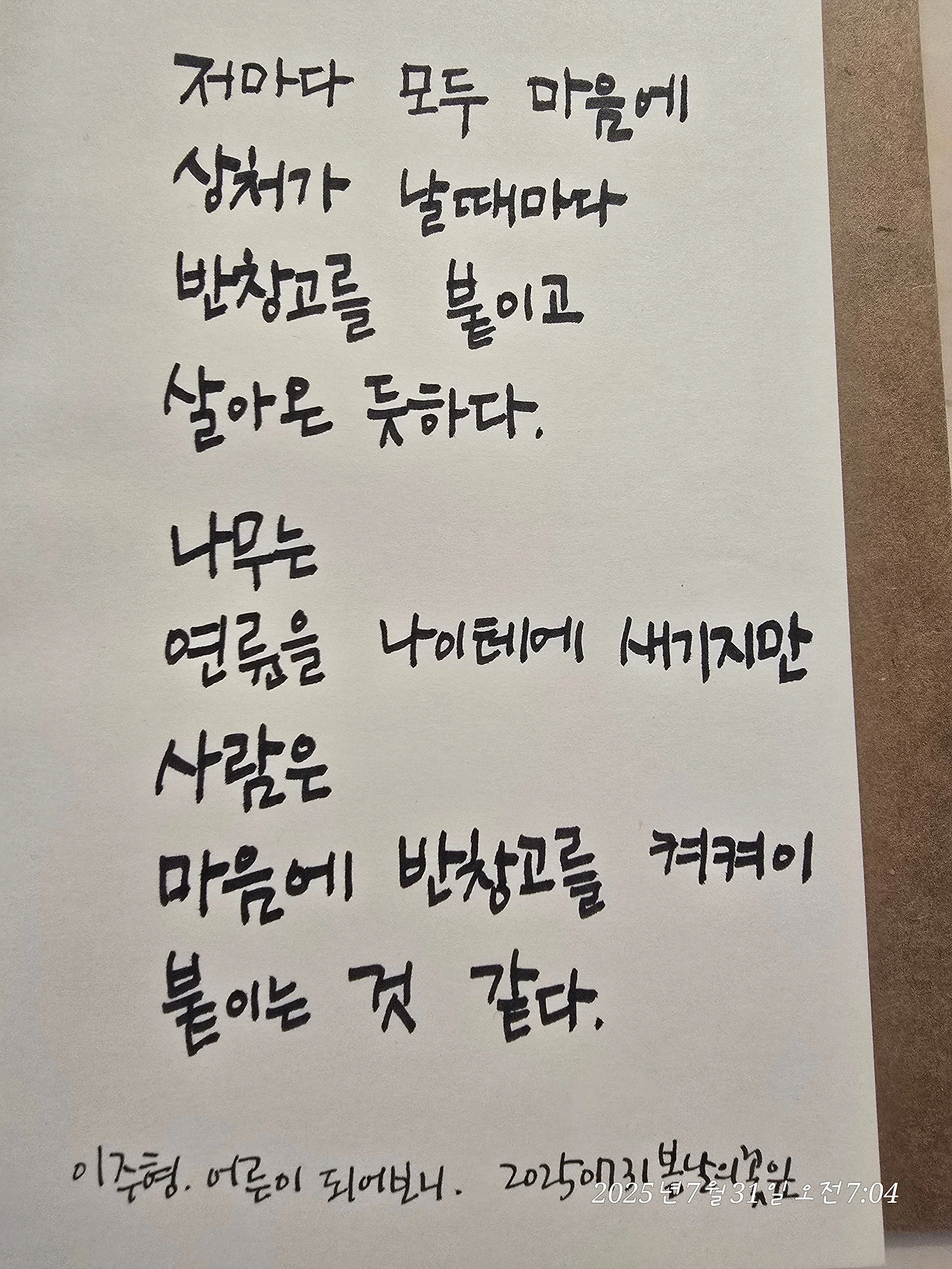 “나무는 나이테를 새기지만, 사람은 마음에 반창고를 켜켜이 붙인다.”