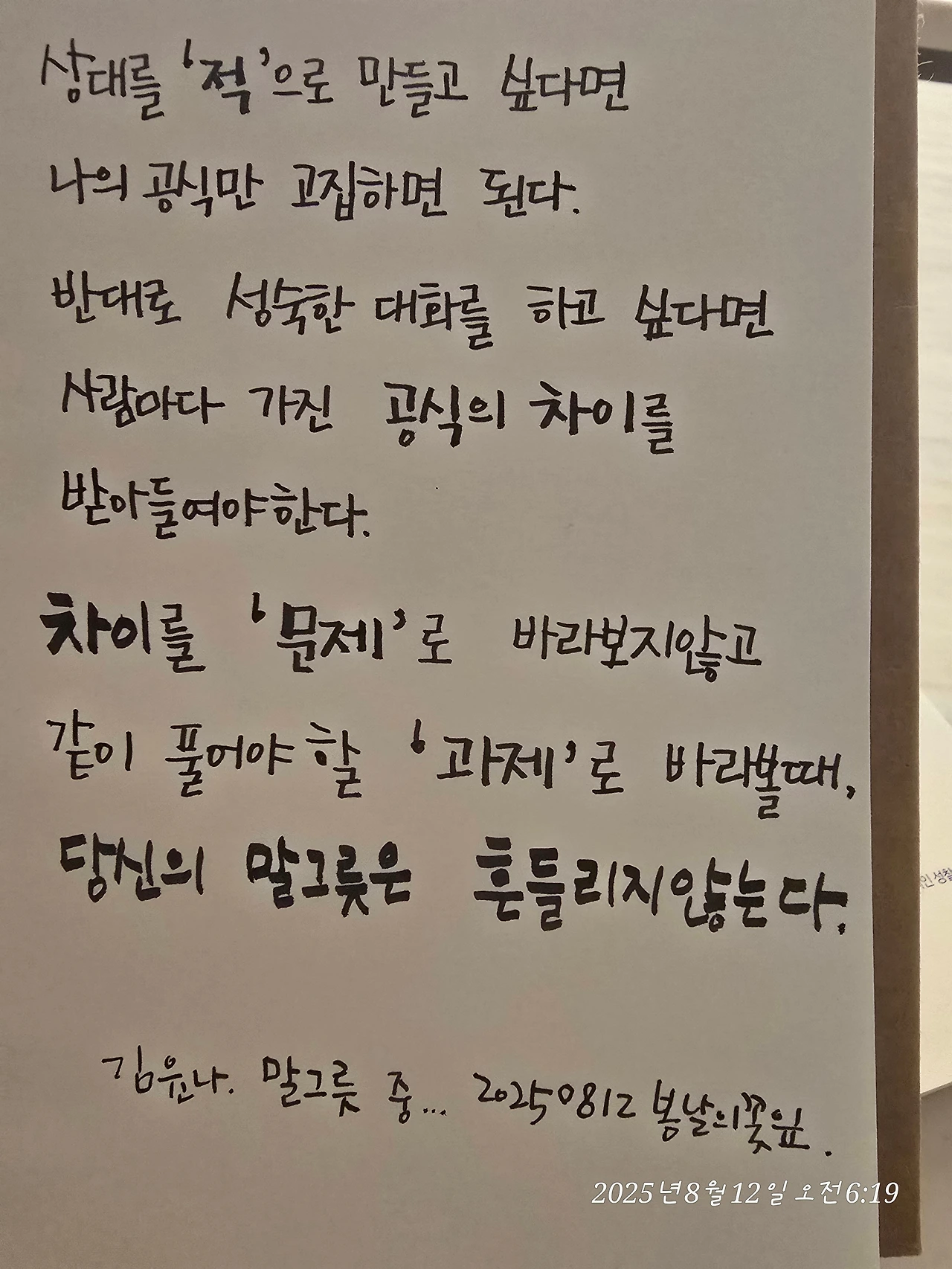 다른 의견 앞에서 마음을 닫기보다, 그 차이를 과제로 품고 한 걸음 더 다가가는 대화를.