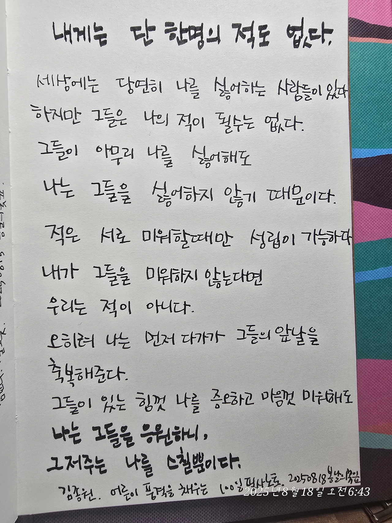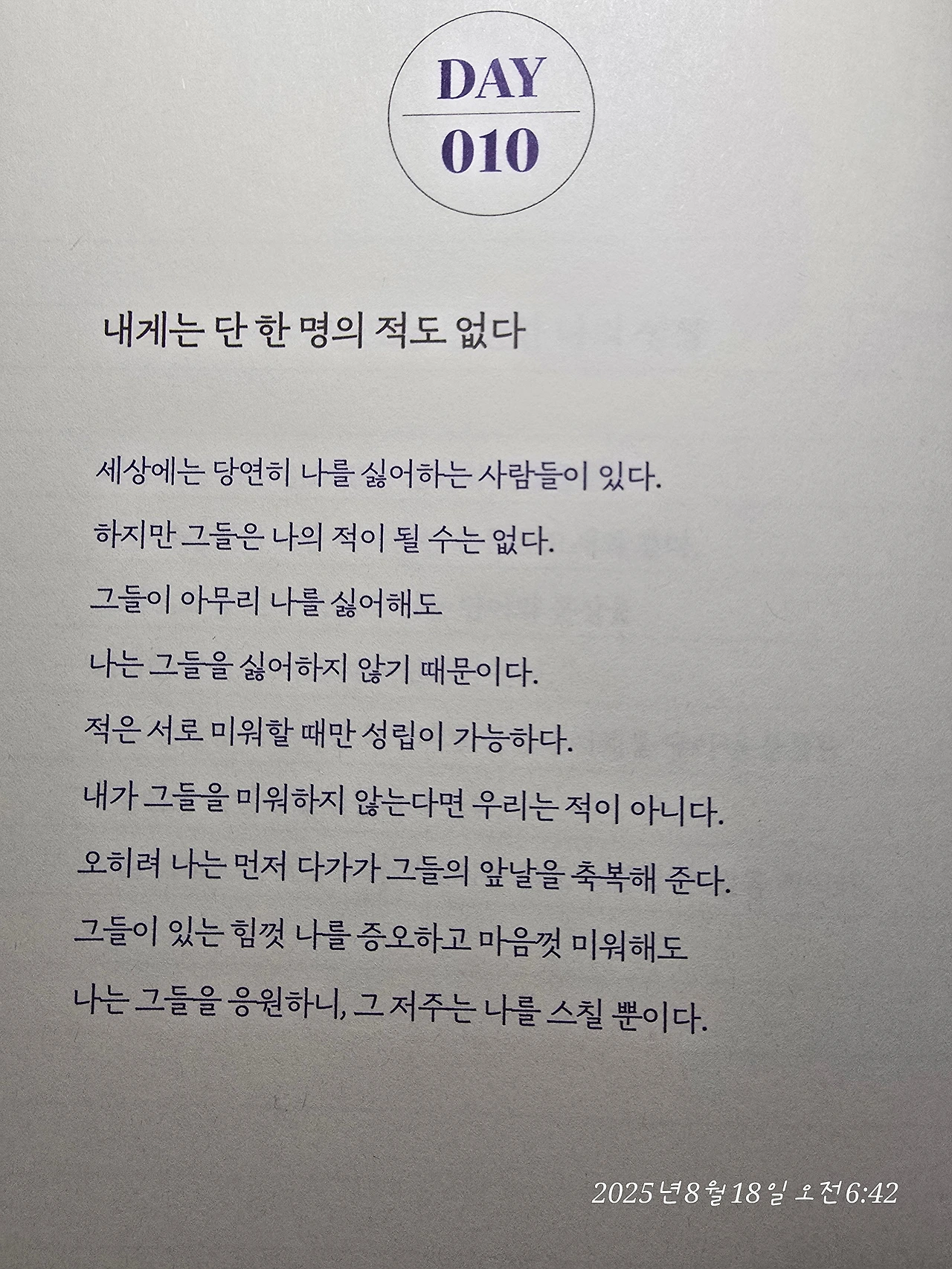 어쩌면 그들은 나의 작은 행동 하나에도 트집을 잡고, 내가 가진 것을 질투하고, 심지어 내 마음을 몰라주며 날카로운 말로 상처를 주기도 한다. 하지만 그들이 결코 나의 적이 될 수는 없다. 적은 서로 미워할 때만 성립하기 때문이다. 내가 그들을 미워하지 않는다면, 우리는 결코 적이 아니다.