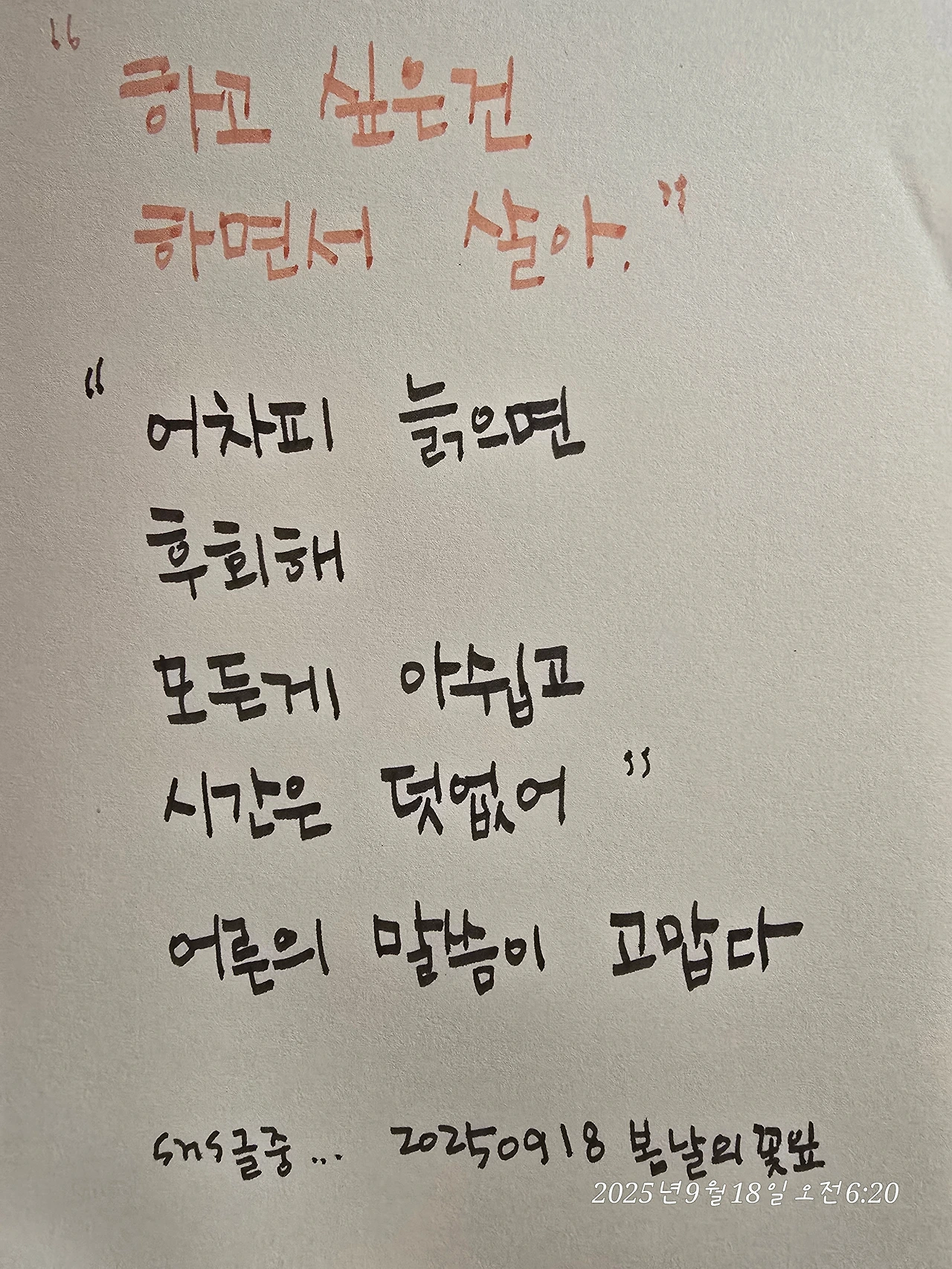 단순한 글귀 같지만, 그 속에는 살아본 이들만이 전할 수 있는 진실이 담겨 있다. 나는 지금까지 하고 싶은 걸 다 하며 살아왔을까. 대답은 선뜻 나오지 않는다. 분명 나름대로 열심히 살아왔지만, 그 속에는 미뤘던 것도 있고 끝내 포기했던 것도 있다. 그때는 어쩔 수 없었다고 스스로를 달래보지만, 시간이 흘러 돌아보면 그것들은 후회보다 아쉬움으로 남는다.