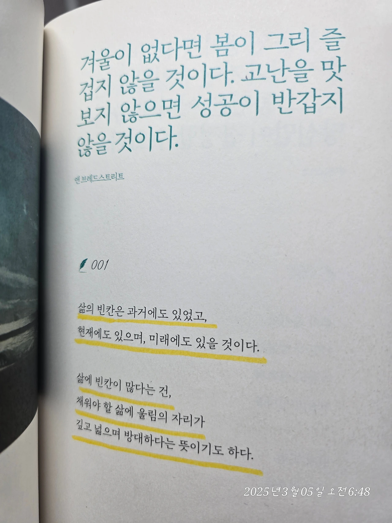 하지만 겨울이 있기에 봄을 더 간절히 바라게 된다. 그리고 언젠가 따뜻한 햇살이 스며들 때, 우리는 비로소 이 계절이 지나갔음을 깨닫는다.
