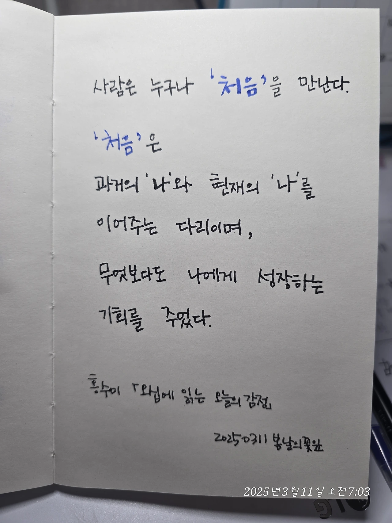 처음은 나를 돌아보게 하고, 과거의 나와 현재의 나를 이어주는 다리이며, 무엇보다도 성장할 기회를 준다. 누구나 처음에는 서툴다. 하지만 그 서툴렀던 순간들도 결국은 지나고 나면 소중한 경험이 되어 우리에게 남는다는것을 우리는 안다.