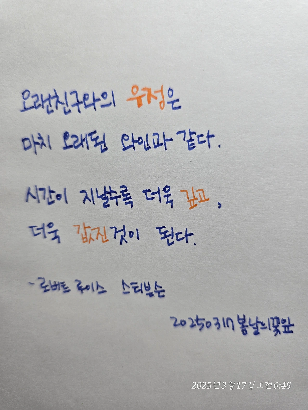 "오랜 친구와의 우정은 마치 오래된 와인과 같다. 시간이 지날수록 더욱 깊고, 더욱 값진 것이 된다."