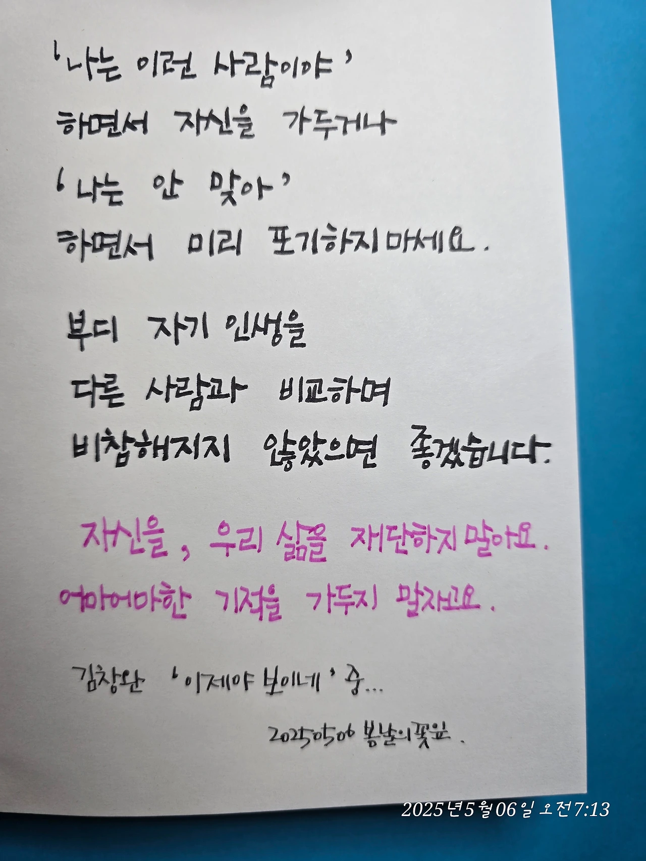 부디 자기 인생을 다른 사람과 비교하며 비참해지지 않았으면 좋겠습니다.