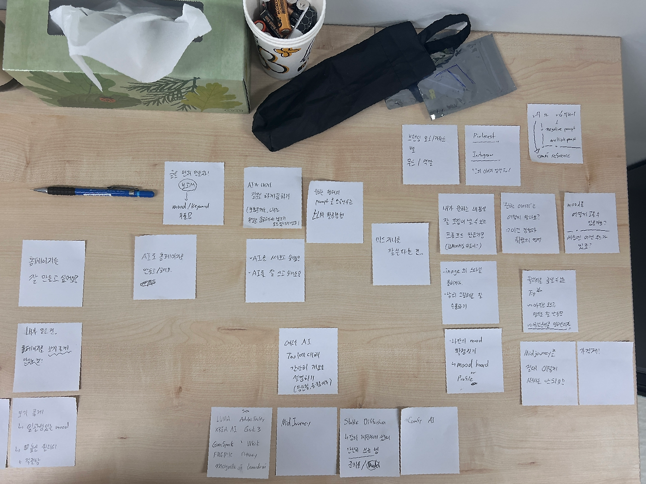 그래서 우선 오늘 머릿속에서 났던 생각들을 검열 없이 포스트잇에 하나씩 적어봤다. “내가 생각하는 강연 내용”들을 적어봤다. 내 생각이라는 빈 맵을 한 번 다 지나가면서, 이제 맵에 어두운 곳을 꽤 많이 밝혔다는 인상을 받았다. 나쁘지 않은 방법이었던 것 같다.
