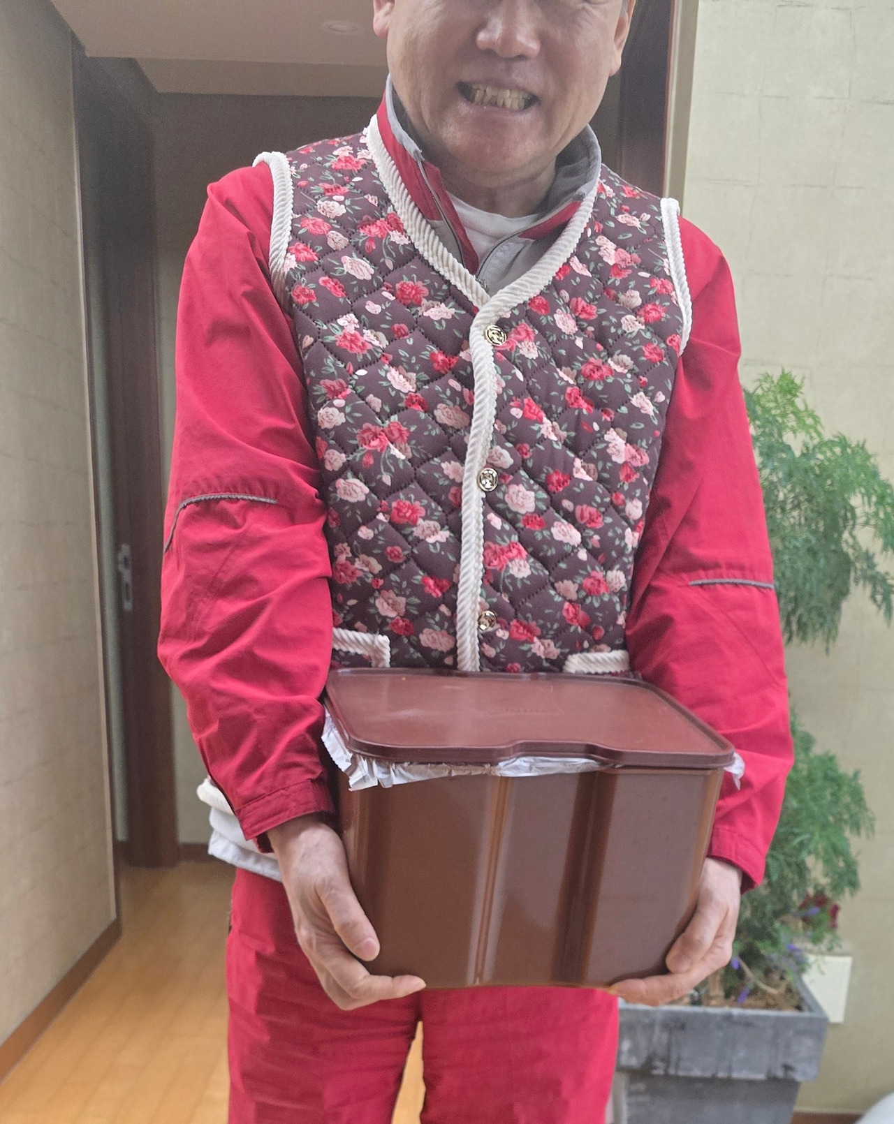 뚝딱뚝딱 두 번 만지더니 통속으로 넣는다