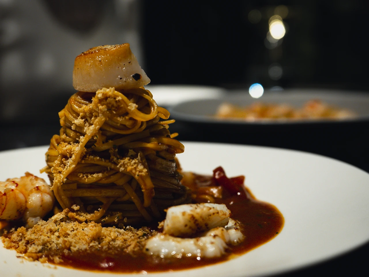 오징어, 관자, 랑구스틴이 들어간 토마토소스 베이스의 해산물 파스타. 해산물 라구가 더 적절할 듯하다. 오징어 내장과 랑구스틴의 머리와 껍질에서 해산물의 진득한 소스를 뽑았다. 비스크 소스와는 다른 느낌. 비스크 소스는 갑각류의 향이 강하고 산미보다는 감칠맛과 농축된 농후함이 강하지만 이 파스타의 소스는 토마토소스를 베이스로해서 산미가 주가 되고 거기에 해산물에서 뽑아낸 감칠맛과 농후함이 살짝 곁들여진 느낌이다. 개인적으로 일반 토마토 해산물 파스타일 줄 알고 별로 기대를 안했는데 맛있었다.