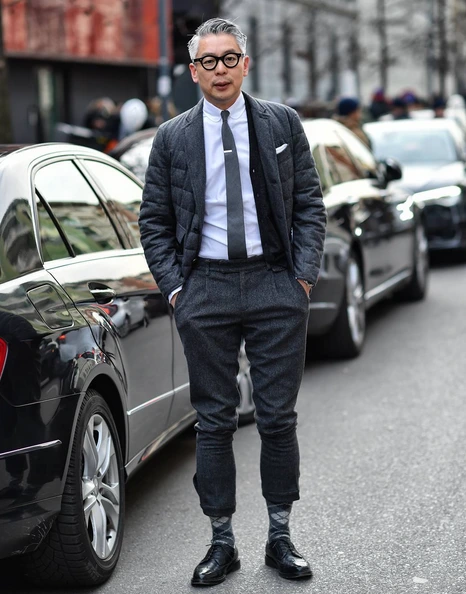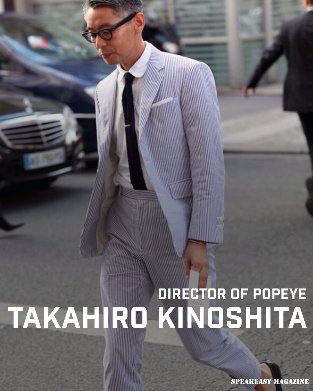 잡지 뽀빠이의 편집장인 타카히로 키노시타도 톰브라운을 애용하기로 유명한데 키노시타는 톰브라운 특유의 위트 있으면서도 지적인 이미지를 잘 보여줬다. 남성적인 골격과 각진 얼굴형을 띤 닉 우스터와 다르게 타카히로는 전형적인 동양인의 체격으로 둥글고 부드러운 인상을 가졌지만 안경으로 포인트를 주어 밋밋할 수도 있는 얼굴에 포인트를 주었고 톰브라운의 깔끔한 그레이톤과 딱 떨어지는 실루엣과 어우러져 굉장히 차분하면서도 지적인 느낌을 볼 수 있다. 그리고 중간에 톰브라운의 삼선과 체크 양말이 과하지 않게 위트를 보여주는 것도 하나의 센스.