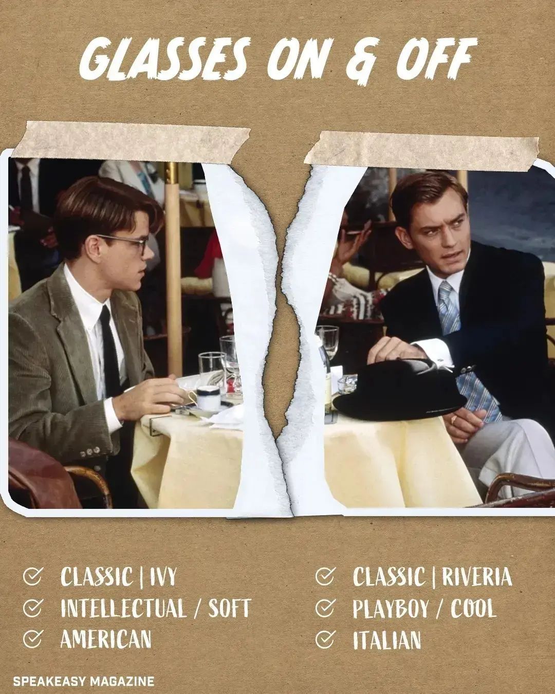 영화 리플리에서 그 면모가 잘 드러나는데 캐주얼한, 이탈리안 클래식 룩을 입은 딕키와는 다르게 리플리는 전형적인 아메리칸 클래식, 아이비 느낌의 스타일을 선보였는데 아넬 안경이 룩의 완성도를 높였다. 누가 봐도 프린스턴 대학교를 나온 사람처럼 보인다…실제로는 아니지만