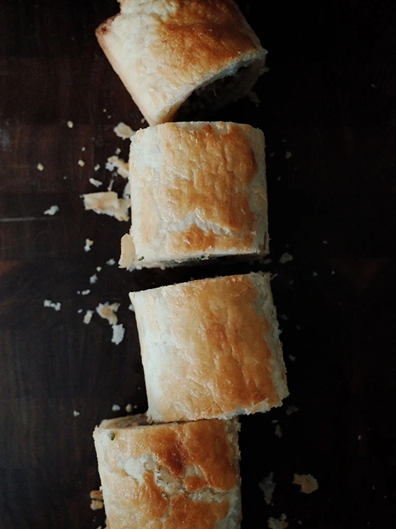 - 퍼프 페이스트리 시트의 레시피는 지난 '메이즈 오브 오너 타르트' 편을 참고하면 되겠다. 필링으로 사용할 소시지 미트는 구할 수 없어 떡갈비 패티를 대신 사용했다. 다진 고기를 이용해 직접 만드는 방법도 있지만.. 귀찮으므로. 생 타임이 있다면 꼭 넣자. 넣는 것과 넣지 않는 것 간에 맛의 차이가 크다.